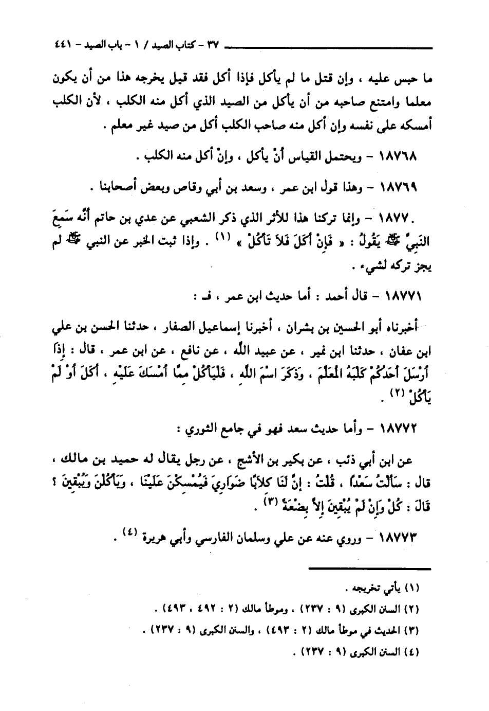 18771 - قَالَ أَحْمَدُ: أَمَّا حَدِيثُ ابْنِ عُمَرَ: فَأَخْبَرَنَاهُ أَبُو الْحُسَيْنِ بْنُ بِشْرَانَ، أَخْبَرَنَا إِسْمَاعِيلُ الصَّفَّارُ، حَدَّثَنَا الْحَسَنُ بْنُ عَلِيِّ بْنِ عَفَّانَ، حَدَّثَنَا ابْنُ نُمَيْرٍ، عَنْ عُبَيْدِ اللَّهِ، عَنْ نَافِعٍ، عَنِ ابْنِ عُمَرَ قَالَ: «§إِذَا أَرْسَلَ أَحَدُكُمْ كَلْبَهُ الْمُعَلَّمَ، وَذَكَرَ اسْمَ اللَّهِ، فَلْيَأْكُلْ مِمَّا أَمْسَكَ عَلَيْهِ، أَكَلَ أَوْ لَمْ يَأْكُلْ»