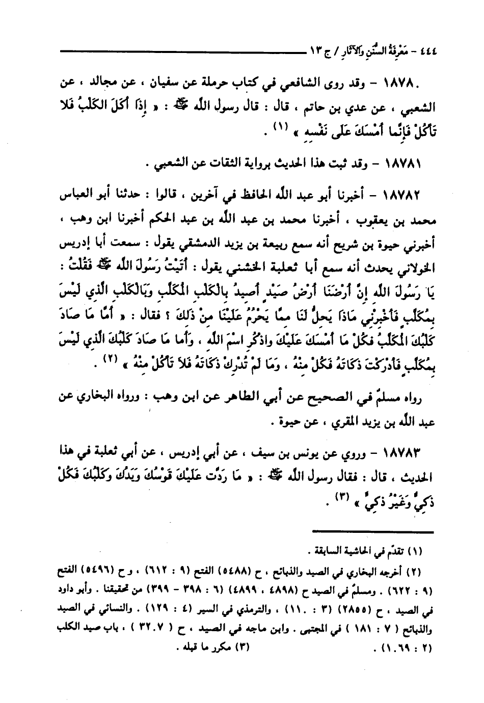 18782 - أَخْبَرَنَا أَبُو عَبْدِ اللَّهِ الْحَافِظُ فِي آخَرِينَ، قَالُوا: حَدَّثَنَا أَبُو الْعَبَّاسِ مُحَمَّدُ بْنُ يَعْقُوبَ، أَخْبَرَنَا مُحَمَّدُ بْنُ عَبْدِ اللَّهِ بْنِ عَبْدِ الْحَكَمِ، أَخْبَرَنَا ابْنُ وَهْبٍ، أَخْبَرَنِي حَيْوَةُ بْنُ شُرَيْحٍ، أَنَّهُ سَمِعَ رَبِيعَةَ بْنَ يَزِيدَ الدِّمَشْقِيَّ، يَقُولُ: سَمِعْتُ أَبَا إِدْرِيسَ الْخَوْلَانِيَّ، يُحَدِّثُ أَنَّهُ سَمِعَ أَبَا ثَعْلَبَةَ الْخُشَنِيَّ، يَقُولُ: أَتَيْتُ رَسُولَ اللَّهِ صَلَّى اللهُ عَلَيْهِ وَسَلَّمَ فَقُلْتُ: يَا رَسُولَ اللَّهِ، إِنَّ أَرْضَنَا أَرْضُ صَيْدٍ أَصِيدُ بِالْكَلْبِ الْمُكَلَّبِ، وَبِالْكَلْبِ الَّذِي لَيْسَ بِمُكَلَّبٍ، فَأَخْبِرْنِي مَاذَا يَحِلُّ لَنَا مِمَّا يَحْرُمُ عَلَيْنَا مِنْ ذَلِكَ، فَقَالَ: «أَمَّا §مَا صَادَ كَلْبُكَ الْمُكَلَّبُ فَكُلْ مَا أَمْسَكَ عَلَيْكَ وَاذْكُرِ اسْمَ اللَّهِ، وَأَمَّا مَا صَادَ كَلْبُكَ الَّذِي لَيْسَ بِمُكَلَّبٍ فَأَدْرَكْتَ ذَكَاتَهُ فَكُلْ مِنْهُ، وَمَا لَمْ تُدْرِكْ ذَكَاتَهُ فَلَا تَأْكُلْ مِنْهُ» رَوَاهُ مُسْلِمٌ فِي الصَّحِيحِ عَنْ أَبِي الطَّاهِرِ، عَنِ ابْنِ وَهْبٍ وَرَوَاهُ الْبُخَارِيُّ، عَنْ عَبْدِ اللَّهِ بْنِ يَزِيدَ الْمُقْرِئِ، عَنْ حَيْوَةَ