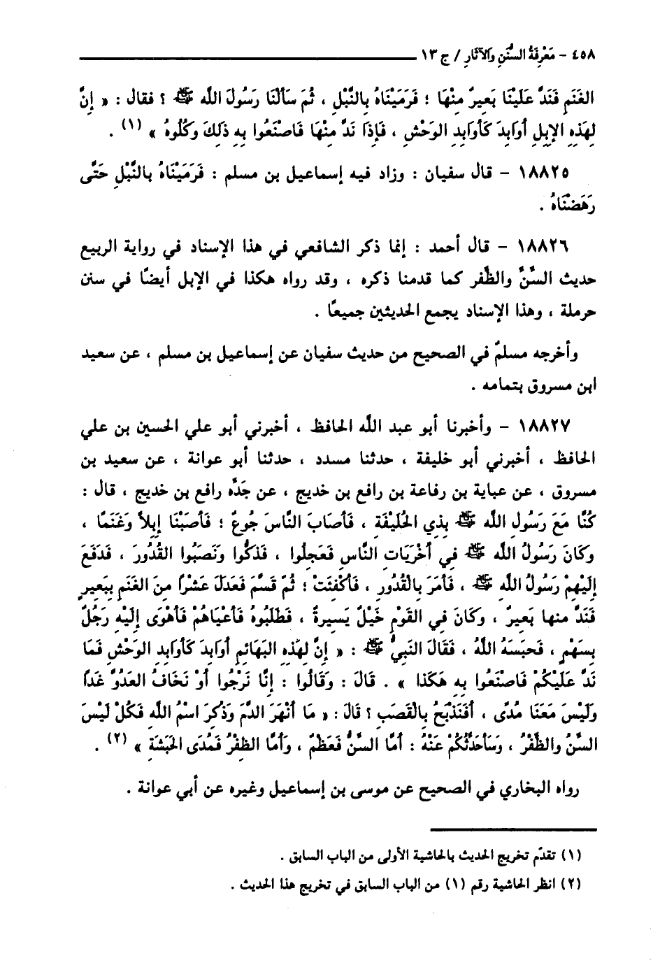 18827 - وَأَخْبَرَنَا أَبُو عَبْدِ اللَّهِ الْحَافِظُ، أَخْبَرَنِي أَبُو عَلِيٍّ الْحُسَيْنُ بْنُ عَلِيٍّ الْحَافِظُ، أَخْبَرَنِي أَبُو خَلِيفَةَ، حَدَّثَنَا مُسَدَّدٌ، حَدَّثَنَا أَبُو عَوَانَةَ، عَنْ سَعِيدِ بْنِ مَسْرُوقٍ، عَنْ عَبَايَةَ بْنِ رِفَاعَةَ بْنِ رَافِعِ بْنِ خَدِيجٍ، عَنْ جَدِّهِ رَافِعِ بْنِ خَدِيجٍ قَالَ: كُنَّا مَعَ رَسُولِ اللَّهِ صَلَّى اللهُ عَلَيْهِ وَسَلَّمَ بِذِي الْحُلَيْفَةِ فَأَصَابَ النَّاسَ جُوعٌ، فَأَصَبْنَا إِبِلًا وَغَنَمًا، وَكَانَ رَسُولُ اللَّهِ صَلَّى اللهُ عَلَيْهِ وَسَلَّمَ فِي أُخْرَيَاتِ النَّاسِ فَعَجِلُوا فَذَكُّوا وَنَصَبُوا الْقُدُورَ، فَدَفَعَ إِلَيْهِمْ رَسُولُ اللَّهِ صَلَّى اللهُ عَلَيْهِ وَسَلَّمَ، فَأَمَرَ بِالْقُدُورِ فَأُكْفِئَتْ، ثُمَّ قَسَّمَ فَعَدَلَ عَشْرًا مِنَ الْغَنَمِ بِبَعِيرٍ، فَنَدَّ مِنْهَا بَعِيرٌ، وَكَانَ فِي الْقَوْمِ خَيْلٌ يَسِيرَةٌ، فَطَلَبُوهُ فَأَعْيَاهُمْ فَأَهْوَى إِلَيْهِ رَجُلٌ بِسَهْمٍ، فَحَبَسَهُ اللَّهُ، فَقَالَ النَّبِيُّ صَلَّى اللهُ عَلَيْهِ وَسَلَّمَ: «إِنَّ §لِهَذِهِ الْبَهَائِمِ أَوَابِدَ كَأَوَابِدِ الْوَحْشِ، فَمَا نَدَّ عَلَيْكُمْ فَاصْنَعُوا بِهِ هَكَذَا» قَالَ: وَقَالُوا: إِنَّا نَرْجُو أَوْ نَخَافُ الْعَدُوَّ غَدًا وَلَيْسَ مَعَنَا مُدًى، أَفَنَذْبَحُ بِالْقَصَبِ؟ قَالَ: " مَا أَنْهَرَ الدَّمَ وَذُكِرَ اسْمُ اللَّهِ فَكُلْ لَيْسَ السِّنَّ وَالظُّفْرَ، وَسَأُحَدِّثُكُمْ عَنْهُ: أَمَّا السِّنُّ فَعَظْمٌ، وَأَمَّا الظُّفْرُ فَمُدَى الْحَبَشَةِ " رَوَاهُ الْبُخَارِيُّ فِي الصَّحِيحِ عَنْ مُوسَى بْنِ إِسْمَاعِيلَ وَغَيْرِهِ، عَنْ أَبِي عَوَانَةَ