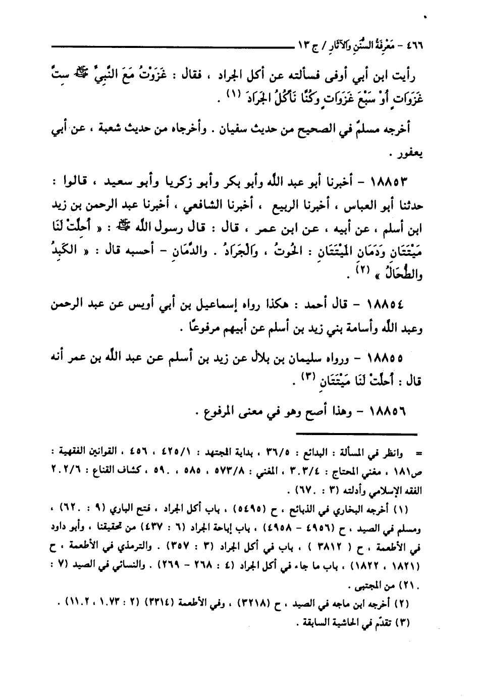 18853 - أَخْبَرَنَا أَبُو عَبْدِ اللَّهِ، وَأَبُو بَكْرٍ، وَأَبُو زَكَرِيَّا، وَأَبُو سَعِيدٍ، قَالُوا: حَدَّثَنَا أَبُو الْعَبَّاسِ، أَخْبَرَنَا الرَّبِيعُ، أَخْبَرَنَا الشَّافِعِيُّ، أَخْبَرَنَا عَبْدُ الرَّحْمَنِ بْنُ زَيْدِ بْنِ أَسْلَمَ، عَنْ أَبِيهِ، عَنِ ابْنِ عُمَرَ قَالَ: قَالَ رَسُولُ اللَّهِ صَلَّى اللهُ عَلَيْهِ وَسَلَّمَ: " §أُحِلَّتْ لَنَا مَيْتَتَانِ وَدَمَانِ، الْمَيْتَتَانِ: الْحُوتُ، وَالْجَرَادُ، وَالدَّمَانِ - أَحْسَبُهُ قَالَ - الْكَبِدُ وَالطِّحَالُ "