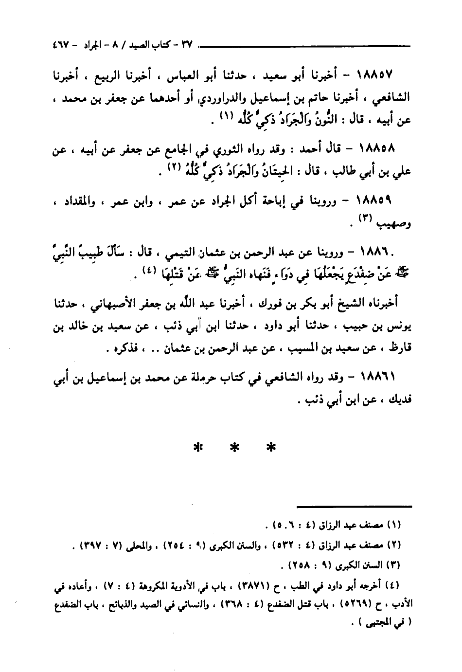18859 - وَرُوِّينَا فِي إِبَاحَةِ أَكْلِ الْجَرَادِ عَنْ عُمَرَ، وَابْنِ عُمَرَ، وَالْمِقْدَادِ، وَصُهَيْبٍ