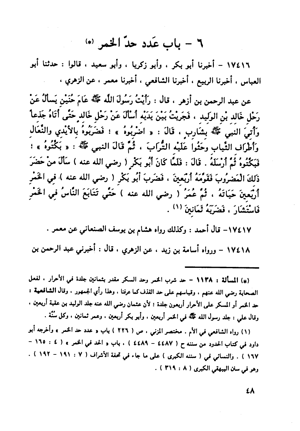 17416 - أَخْبَرَنَا أَبُو بَكْرٍ، وَأَبُو زَكَرِيَّا، وَأَبُو سَعِيدٍ، قَالُوا: حَدَّثَنَا أَبُو الْعَبَّاسِ، أَخْبَرَنَا الرَّبِيعُ، أَخْبَرَنَا الشَّافِعِيُّ، أَخْبَرَنَا مَعْمَرٌ، عَنِ الزُّهْرِيِّ، عَنْ عَبْدِ الرَّحْمَنِ بْنِ أَزْهَرَ قَالَ: رَأَيْتُ رَسُولَ اللَّهِ صَلَّى اللهُ عَلَيْهِ وَسَلَّمَ عَامَ حُنَيْنٍ يَسْأَلُ عَنْ رَحْلِ خَالِدِ بْنِ الْوَلِيدِ، فَجَرَيْتُ بَيْنَ يَدَيْهِ أَسْأَلُ عَنْ رَحْلِ خَالِدٍ حَتَّى أَتَاهُ جَذِعًا، §وَأُتِيَ النَّبِيُّ صَلَّى اللهُ عَلَيْهِ وَسَلَّمَ بِشَارِبٍ قَالَ: «اضْرِبُوهُ»، فَضَرَبُوهُ بِالْأَيْدِي وَالنِّعَالِ وَأَطْرَافِ الثِّيَابِ وَحَثَوْا عَلَيْهِ التُّرَابَ، ثُمَّ قَالَ النَّبِيُّ صَلَّى اللهُ عَلَيْهِ وَسَلَّمَ «بَكِّتُوهُ»، فَبَكَّتُوهُ، ثُمَّ أَرْسَلَهُ قَالَ: فَلَمَّا كَانَ أَبُو بَكْرٍ رَضِيَ اللَّهُ عَنْهُ سَأَلَ مَنْ حَضَرَ ذَلِكَ الْمَضْرُوبَ، فَقَوَّمَهُ أَرْبَعِينَ، فَضَرَبَ أَبُو بَكْرٍ رَضِيَ اللَّهُ عَنْهُ فِي الْخَمْرِ أَرْبَعِينَ حَيَاتَهُ، ثُمَّ عُمَرُ رَضِيَ اللَّهُ عَنْهُ، حَتَّى تَتَابَعَ النَّاسُ فِي الْخَمْرِ فَاسْتَشَارَ فَضَرَبَهُ ثَمَانِينَ