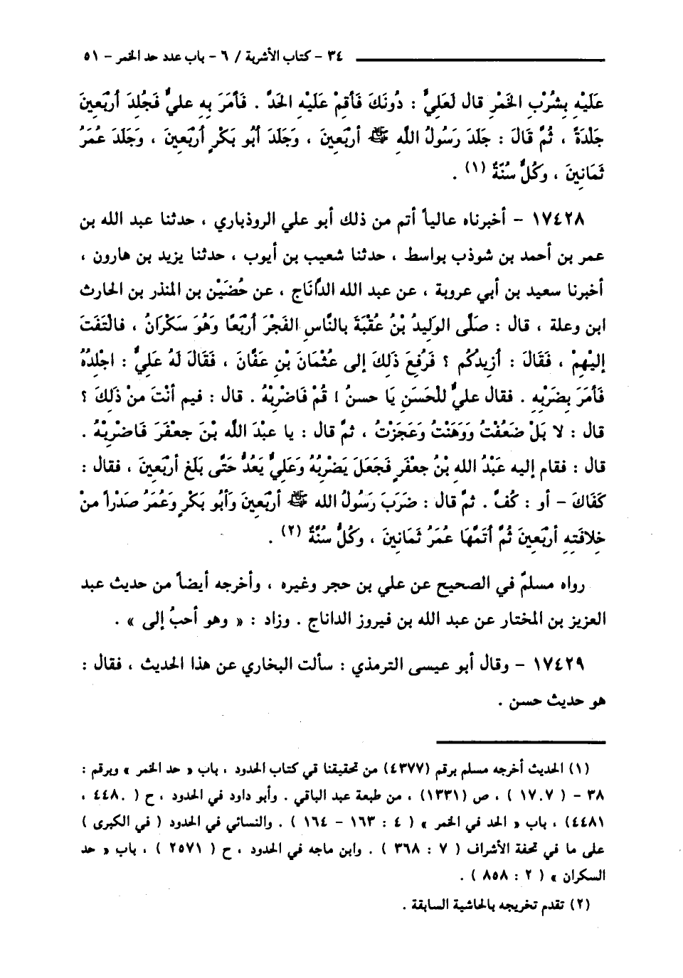 17428 - أَخْبَرَنَاهُ عَالِيًا أَتَمَّ مِنْ ذَلِكَ أَبُو عَلِيٍّ الرُّوذْبَارِيُّ، حَدَّثَنَا عَبْدُ اللَّهِ بْنُ عُمَرَ بْنِ أَحْمَدَ بْنِ شَوْذَبٍ، بِوَاسِطَ، حَدَّثَنَا شُعَيْبُ بْنُ أَيُّوبَ، حَدَّثَنَا يَزِيدُ بْنُ هَارُونَ، أَخْبَرَنَا سَعِيدُ بْنُ أَبِي عَرُوبَةَ، عَنْ عَبْدِ اللَّهِ الدَّانَاجِ، عَنْ حُضَيْنِ بْنِ الْمُنْذِرِ بْنِ الْحَارِثِ بْنِ وَعْلَةَ قَالَ: صَلَّى الْوَلِيدُ بْنُ عُقْبَةَ بِالنَّاسِ الْفَجْرَ أَرْبَعًا، وَهُوَ سَكْرَانُ، فَالْتَفَتَ إِلَيْهِمْ فَقَالَ: أَزِيدُكُمْ؟ فَرُفِعَ ذَلِكَ إِلَى عُثْمَانَ بْنِ عَفَّانَ، فَقَالَ لَهُ عَلِيٌّ: §اجْلِدْهُ، فَأَمَرَ بِضَرْبِهِ، فَقَالَ عَلِيٌّ لِلْحَسَنِ: يَا حَسَنُ، قُمْ فَاضْرِبْهُ قَالَ: فِيمَ أَنْتَ مِنْ ذَلِكَ؟ قَالَ: لَا، بَلْ ضَعُفْتَ وَوَهَنْتَ وَعَجَزْتَ، ثُمَّ قَالَ: يَا عَبْدَ اللَّهِ بْنَ جَعْفَرٍ فَاضْرِبْهُ قَالَ: فَقَامَ إِلَيْهِ عَبْدُ اللَّهِ بْنُ جَعْفَرٍ فَجَعَلَ يَضْرِبُهُ، وَعَلِيٌّ يَعُدُّ حَتَّى بَلَغَ أَرْبَعِينَ، فَقَالَ: كَفَاكَ - أَوْ كُفَّ - ثُمَّ قَالَ ضَرَبَ رَسُولُ اللَّهِ صَلَّى اللهُ عَلَيْهِ وَسَلَّمَ أَرْبَعِينَ , وَأَبُو بَكْرٍ وَعُمَرُ صَدْرًا مِنْ خِلَافَتِهِ أَرْبَعِينَ , ثُمَّ أَتَمَّهَا عُمَرُ ثَمَانِينَ، وَكُلٌّ سُنَّةٌ " رَوَاهُ مُسْلِمٌ فِي الصَّحِيحِ عَنْ عَلِيِّ بْنِ حُجْرٍ وَغَيْرِهِ، وَأَخْرَجَهُ أَيْضًا مِنْ حَدِيثِ عَبْدِ الْعَزِيزِ بْنِ الْمُخْتَارِ، عَنْ عَبْدِ اللَّهِ بْنِ فَيْرُوزَ الدَّانَاجِ وَزَادَ: وَهُوَ أَحَبُّ إِلَيَّ