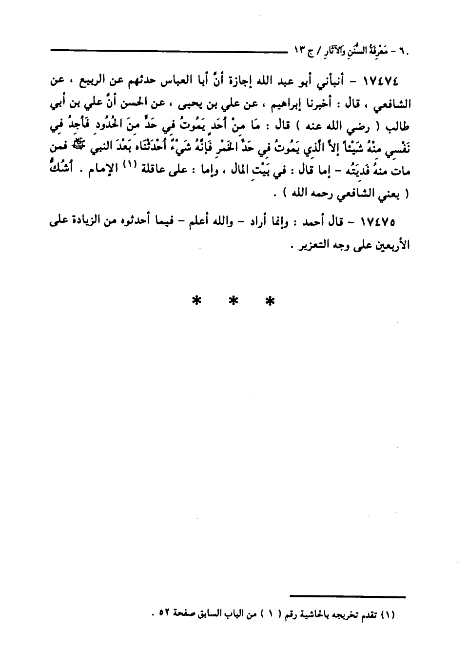17474 - أَنْبَأَنِي أَبُو عَبْدِ اللَّهِ إِجَازَةً، أَنَّ أَبَا الْعَبَّاسِ، حَدَّثَهُمْ، عَنِ الرَّبِيعِ، عَنِ الشَّافِعِيِّ، قَالَ: أَخْبَرَنَا إِبْرَاهِيمُ، عَنْ عَلِيِّ بْنِ يَحْيَى، عَنِ الْحَسَنِ، أَنَّ عَلِيَّ بْنَ أَبِي طَالِبٍ رَضِيَ اللَّهُ عَنْهُ قَالَ: §مَا مِنْ أَحَدٍ يَمُوتُ فِي حَدٍّ مِنَ الْحُدُودِ فَأَجِدُ فِي نَفْسِي مِنْهُ شَيْئًا، إِلَّا الَّذِي يَمُوتُ فِي حَدِّ الْخَمْرِ، فَإِنَّهُ شَيْءٌ أَحْدَثْنَاهُ بَعْدَ النَّبِيِّ صَلَّى اللهُ عَلَيْهِ وَسَلَّمَ، فَمَنْ مَاتَ مِنْهُ فَدِيَتُهُ - إِمَّا قَالَ: فِي بَيْتِ الْمَالِ، وَإِمَّا: عَلَى عَاقِلَةِ الْإِمَامِ " أَشُكُّ، يَعْنِي الشَّافِعِيَّ رَحِمَهُ اللَّهُ.