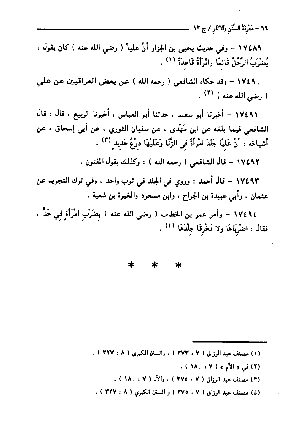 17491 - أَخْبَرَنَا أَبُو سَعِيدٍ، حَدَّثَنَا أَبُو الْعَبَّاسِ، أَخْبَرَنَا الرَّبِيعُ قَالَ: قَالَ الشَّافِعِيُّ فِيمَا بَلَغَهُ، عَنِ ابْنِ مَهْدِيٍّ، عَنْ سُفْيَانَ الثَّوْرِيِّ، عَنْ أَبِي إِسْحَاقَ، عَنْ أَشْيَاخِهِ، أَنَّ عَلِيًّا «§جَلَدَ امْرَأَةً فِي الزِّنَا وَعَلَيْهَا دِرْعٌ حَدِيدٌ»