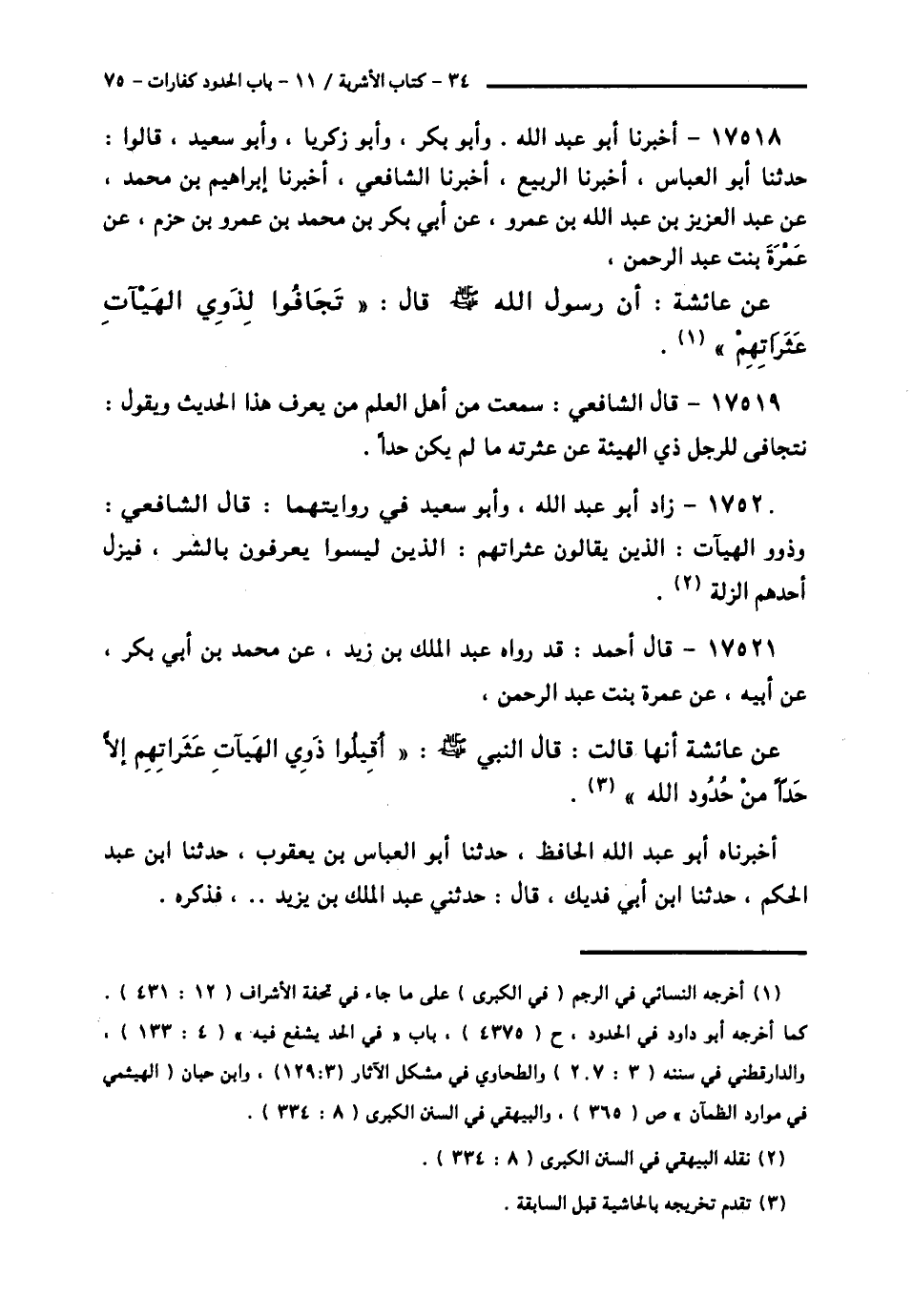 17519 - قَالَ الشَّافِعِيُّ: سَمِعْتُ مِنْ أَهْلِ الْعِلْمِ مَنْ يَعْرِفُ هَذَا الْحَدِيثِ وَيَقُولُ: نَتَجَافَى لِلرَّجُلِ ذِي الْهَيْئَةِ عَنْ عَثْرَتِهِ مَا لَمْ يَكُنْ حَدًّا