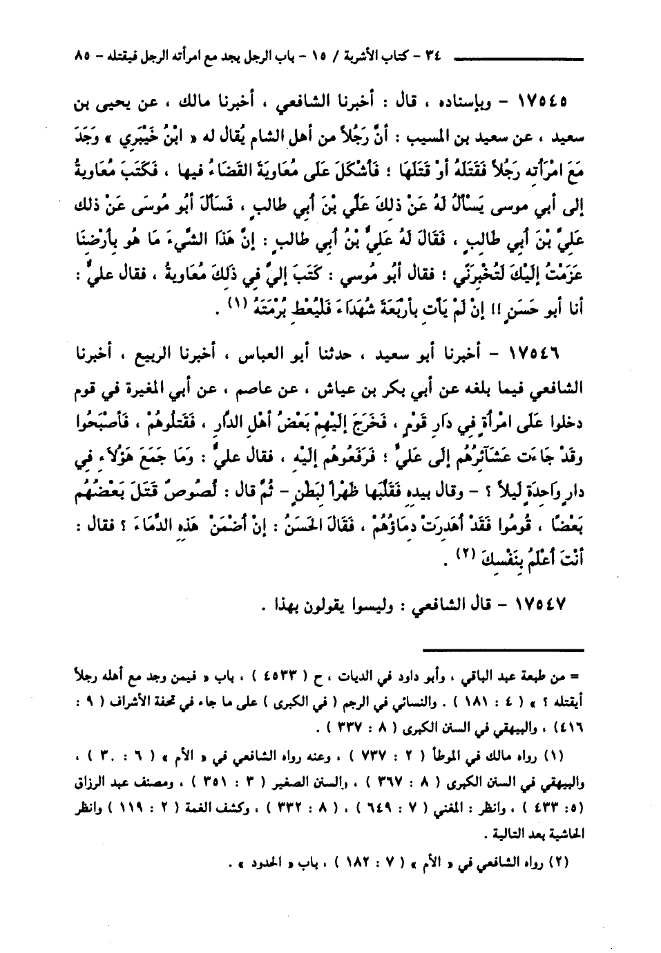 17545 - وَبِإِسْنَادِهِ قَالَ: أَخْبَرَنَا الشَّافِعِيُّ، أَخْبَرَنَا مَالِكٌ، عَنْ يَحْيَى بْنِ سَعِيدٍ، عَنْ سَعِيدِ بْنِ الْمُسَيِّبِ، أَنَّ رَجُلًا مِنْ أَهْلِ الشَّامِ، يُقَالُ لَهُ: ابْنُ خَيْبَرِيٍّ، §وَجَدَ مَعَ امْرَأَتِهِ رَجُلًا فَقَتَلَهُ، أَوْ قَتَلَهَا، فَأُشْكِلَ عَلَى مُعَاوِيَةَ الْقَضَاءُ فِيهَا، فَكَتَبَ مُعَاوِيَةُ إِلَى أَبِي مُوسَى يَسْأَلُ لَهُ عَنْ ذَلِكَ عَلِيَّ بْنَ أَبِي طَالِبٍ، فَسَأَلَ أَبُو مُوسَى عَنْ ذَلِكَ عَلِيَّ بْنَ أَبِي طَالِبٍ، فَقَالَ لَهُ عَلِيُّ بْنُ أَبِي طَالِبٍ: إِنَّ هَذَا الشَّيْءَ مَا هُوَ بِأَرْضِنَا، عَزَمْتُ إِلَيْكَ لَتُخْبِرَنِّي، فَقَالَ أَبُو مُوسَى: كَتَبَ إِلَيَّ فِي ذَلِكَ مُعَاوِيَةُ، فَقَالَ عَلِيٌّ: «أَنَا أَبُو حَسَنٍ» إِنْ لَمْ يَأْتِ بِأَرْبَعَةِ شُهَدَاءَ فَلْيُعْطَ بِرُمَّتِهِ "
