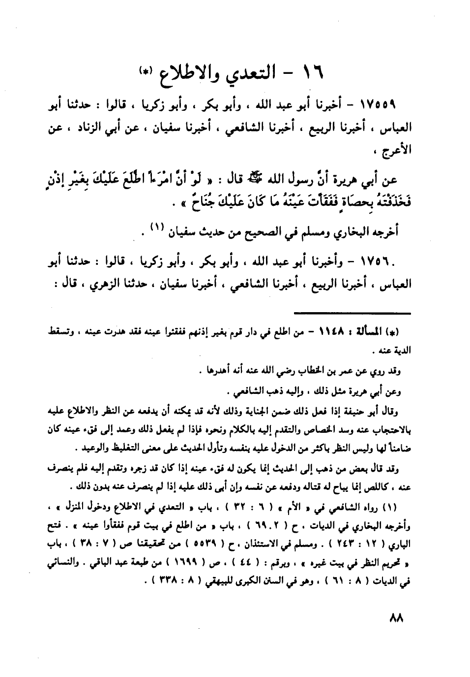 17559 - أَخْبَرَنَا أَبُو عَبْدِ اللَّهِ، وَأَبُو بَكْرٍ، وَأَبُو زَكَرِيَّا، قَالُوا: حَدَّثَنَا أَبُو الْعَبَّاسِ، أَخْبَرَنَا الرَّبِيعُ، أَخْبَرَنَا الشَّافِعِيُّ، أَخْبَرَنَا سُفْيَانُ، عَنْ أَبِي الزِّنَادِ، عَنِ الْأَعْرَجِ، عَنْ أَبِي هُرَيْرَةَ، أَنَّ رَسُولَ اللَّهِ صَلَّى اللهُ عَلَيْهِ وَسَلَّمَ قَالَ: § «لَوْ أَنَّ امْرَأً اطَّلَعَ عَلَيْكَ بِغَيْرِ إِذَنْ فَخَذَفْتَهُ بِحَصَاةٍ فَفَقَأْتَ عَيْنَهُ مَا كَانَ عَلَيْكَ جُنَاحٌ» أَخْرَجَهُ الْبُخَارِيُّ، وَمُسْلِمٌ فِي الصَّحِيحِ مِنْ حَدِيثِ سُفْيَانَ