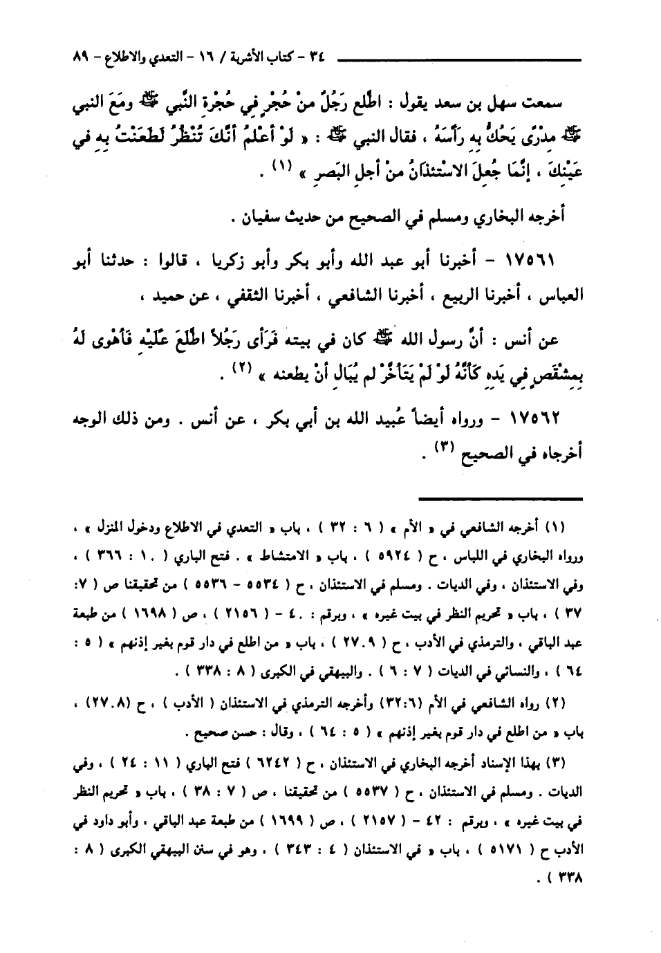 17561 - أَخْبَرَنَا أَبُو عَبْدِ اللَّهِ، وَأَبُو بَكْرٍ، وَأَبُو زَكَرِيَّا، قَالُوا: حَدَّثَنَا أَبُو الْعَبَّاسِ، أَخْبَرَنَا الرَّبِيعُ، أَخْبَرَنَا الشَّافِعِيُّ، أَخْبَرَنَا الثَّقَفِيُّ، عَنْ حُمَيْدٍ، عَنْ أَنَسٍ، «أَنَّ رَسُولَ اللَّهِ صَلَّى اللهُ عَلَيْهِ وَسَلَّمَ كَانَ فِي بَيْتِهِ فَرَأَى رَجُلًا اطَّلَعَ عَلَيْهِ، §فَأَهْوَى لَهُ بِمِشْقَصٍ فِي يَدِهِ كَأَنَّهُ لَوْ لَمْ يَتَأَخَّرْ لَمْ يُبَالِ أَنْ يَطْعَنَهُ»