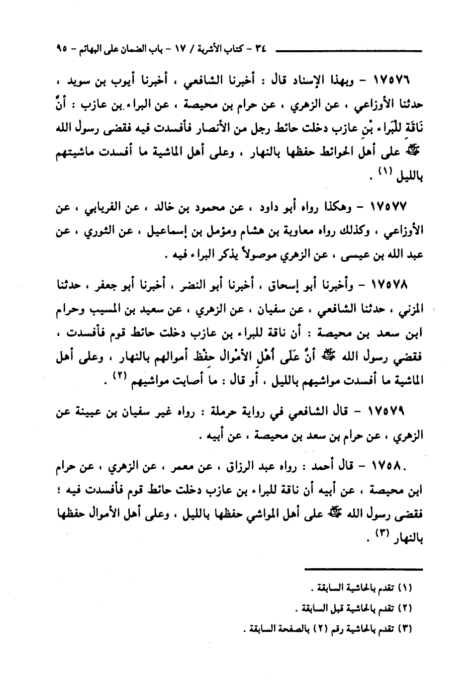 17576 - وَبِهَذَا الْإِسْنَادِ قَالَ: أَخْبَرَنَا الشَّافِعِيُّ، أَخْبَرَنَا أَيُّوبُ بْنُ سُوَيْدٍ، حَدَّثَنَا الْأَوْزَاعِيُّ، عَنِ الزُّهْرِيِّ، عَنْ حَرَامِ بْنِ مُحَيِّصَةَ، عَنِ الْبَرَاءِ بْنِ عَازِبٍ، أَنَّ نَاقَةً لِلْبَرَاءِ بْنِ عَازِبٍ دَخَلَتْ حَائِطَ رَجُلٍ مِنَ الْأَنْصَارِ فَأَفْسَدَتْ فِيهِ، «فَقَضَى رَسُولُ اللَّهِ صَلَّى اللهُ عَلَيْهِ وَسَلَّمَ §عَلَى أَهْلِ الْحَوَائِطِ حِفْظَهَا بِالنَّهَارِ، وَعَلَى أَهْلِ الْمَاشِيَةِ مَا أَفْسَدَتْ مَاشِيَتُهُمْ بِاللَّيْلِ»