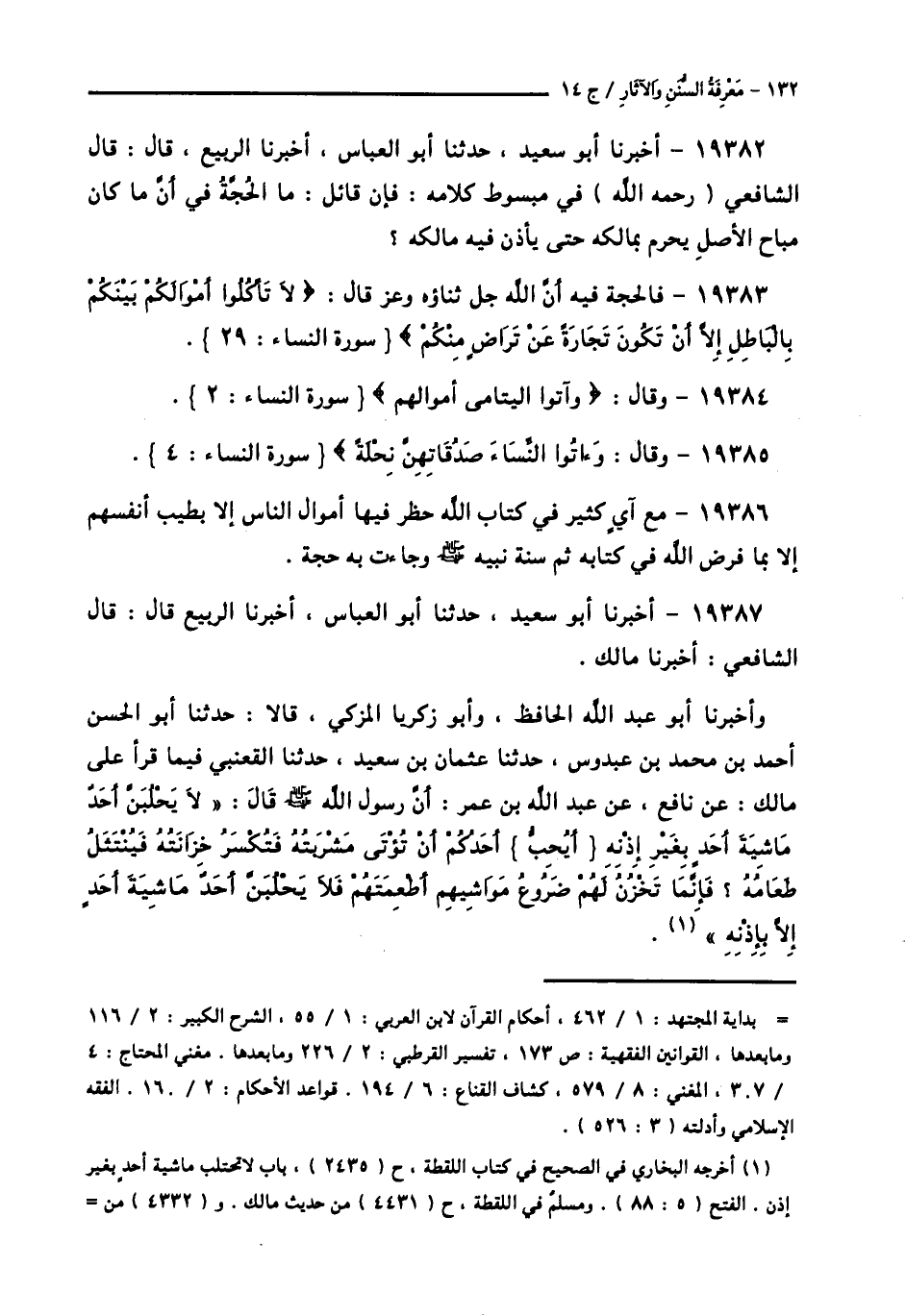 19387 - أَخْبَرَنَا أَبُو سَعِيدٍ، حَدَّثَنَا أَبُو الْعَبَّاسِ، أَخْبَرَنَا الرَّبِيعُ قَالَ: قَالَ الشَّافِعِيُّ، أَخْبَرَنَا مَالِكٌ، وَأَخْبَرَنَا أَبُو عَبْدِ اللَّهِ الْحَافِظُ، وَأَبُو زَكَرِيَّا الْمُزَكِّي قَالَا: حَدَّثَنَا أَبُو الْحَسَنِ أَحْمَدُ بْنُ مُحَمَّدِ بْنِ عَبْدُوسٍ، حَدَّثَنَا عُثْمَانُ بْنُ سَعِيدٍ، حَدَّثَنَا الْقَعْنَبِيُّ، فِيمَا قَرَأَ عَلَى مَالِكٍ، عَنْ نَافِعٍ، عَنْ عَبْدِ اللَّهِ بْنِ عُمَرَ، أَنَّ رَسُولَ اللَّهِ صَلَّى اللهُ عَلَيْهِ وَسَلَّمَ قَالَ: «§لَا يَحْلُبَنَّ أَحَدٌ مَاشِيَةَ أَحَدٍ بِغَيْرِ إِذْنِهِ، أَيُحِبُّ أَحَدُكُمْ أَنْ تُؤْتَى مَشْرُبَتُهُ فَتُكْسَرَ خِزَانَتُهُ فَيُنْتَثَلَ طَعَامُهُ؟ فَإِنَّمَا تَخْزُنُ لَهُمْ ضُرُوعُ مَوَاشِيهِمْ أَطْعِمَتَهُمْ، فَلَا يَحْلُبَنَّ أَحَدٌ مَاشِيَةَ أَحَدٍ إِلَّا بِإِذْنِهِ» -[133]-،