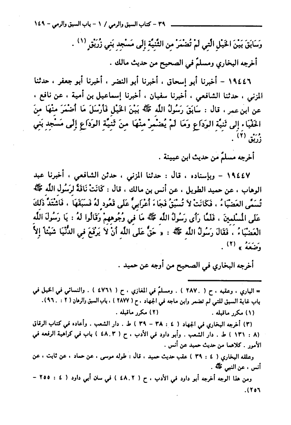19447 - وَبِإِسْنَادِهِ قَالَ: حَدَّثَنَا الْمُزَنِيُّ، حَدَّثَنَا الشَّافِعِيُّ، أَخْبَرَنَا عَبْدُ الْوَهَّابِ، عَنْ حُمَيْدٍ الطَّوِيلِ، عَنْ أَنَسِ بْنِ مَالِكٍ قَالَ: كَانَتْ نَاقَةٌ لِرَسُولِ اللَّهِ صَلَّى اللهُ عَلَيْهِ وَسَلَّمَ تُسَمَّى الْعَضْبَاءَ، فَكَانَتْ لَا تُسْبَقُ، فَجَاءَ أَعْرَابِيٌّ عَلَى قَعُودٍ لَهُ فَسَبَقَهَا، فَاشْتَدَّ ذَلِكَ عَلَى الْمُسْلِمِينَ، فَلَمَّا رَأَى رَسُولُ اللَّهِ صَلَّى اللهُ عَلَيْهِ وَسَلَّمَ مَا فِي وُجُوهِهِمْ وَقَالُوا لَهُ: يَا رَسُولَ اللَّهِ، الْعَضْبَاءُ، فَقَالَ رَسُولُ اللَّهِ صَلَّى اللهُ عَلَيْهِ وَسَلَّمَ: § «حَقٌّ عَلَى اللَّهِ أَنْ لَا يَرْفَعَ فِي الدُّنْيَا شَيْئًا إِلَّا وَضَعَهُ»، أَخْرَجَهُ الْبُخَارِيُّ فِي الصَّحِيحِ مِنْ أَوْجُهٍ، عَنْ حُمَيْدٍ -[150]-