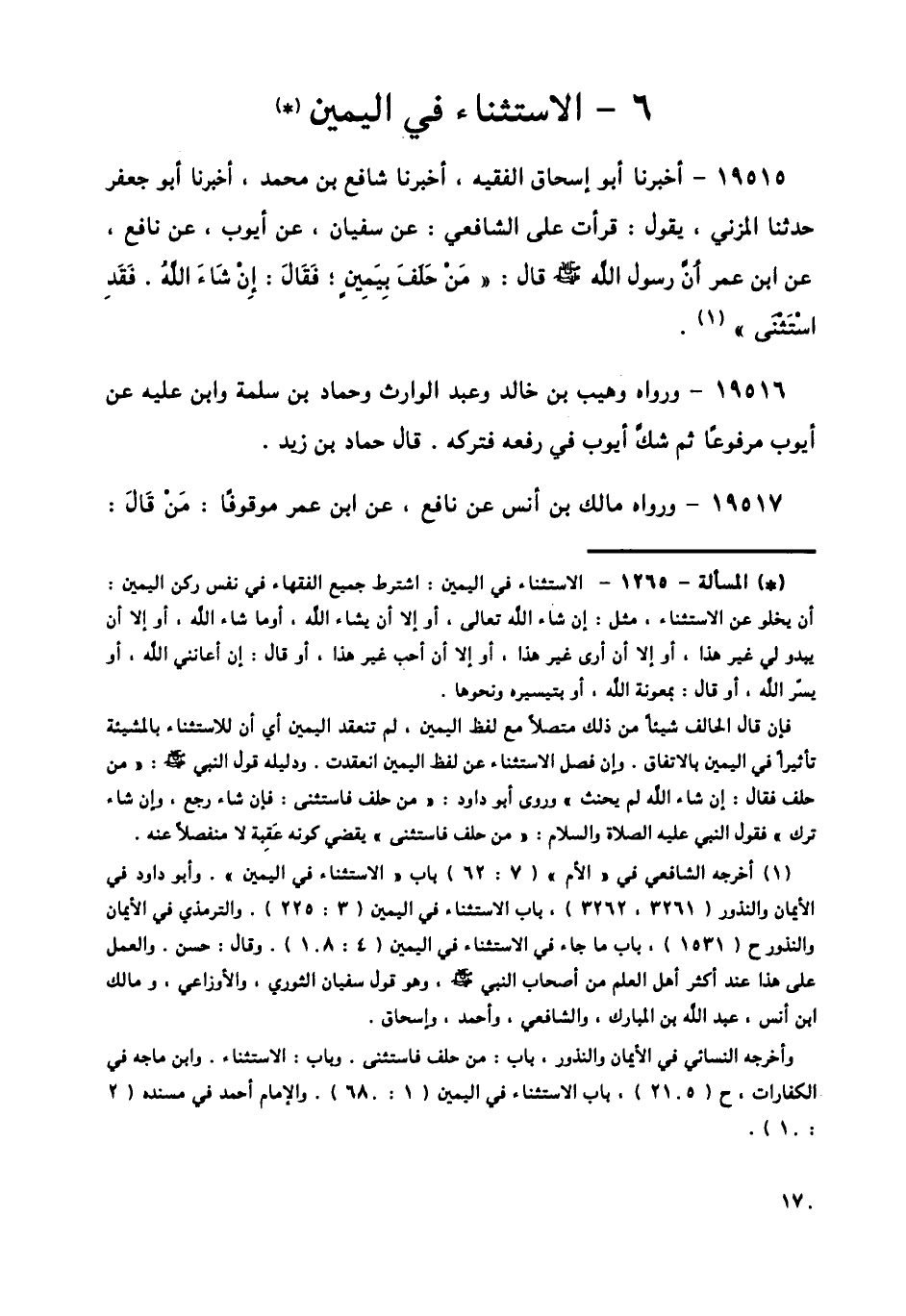 19515 - أَخْبَرَنَا أَبُو إِسْحَاقَ الْفَقِيهُ، أَخْبَرَنَا شَافِعُ بْنُ مُحَمَّدٍ، أَخْبَرَنَا أَبُو جَعْفَرٍ، حَدَّثَنَا الْمُزَنِيُّ، يَقُولُ: قَرَأْتُ عَلَى الشَّافِعِيِّ، عَنْ سُفْيَانَ، عَنْ أَيُّوبَ، عَنْ نَافِعٍ، عَنِ ابْنِ عُمَرَ، أَنَّ رَسُولَ اللَّهِ صَلَّى اللهُ عَلَيْهِ وَسَلَّمَ قَالَ: " §مَنْ حَلَفَ بِيَمِينٍ، فَقَالَ: إِنْ شَاءَ اللَّهُ، فَقَدِ اسْتَثْنَى "،