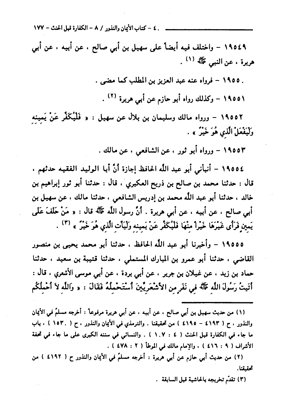 19554 - أَنْبَأَنِي أَبُو عَبْدِ اللَّهِ الْحَافِظُ إِجَازَةً أَنَّ أَبَا الْوَلِيدِ الْفَقِيهُ، حَدَّثَهُمْ قَالَ: حَدَّثَنَا مُحَمَّدُ بْنُ صَالِحِ بْنِ ذُرَيْحٍ الْعُكْبَرِيُّ قَالَ: حَدَّثَنَا أَبُو ثَوْرٍ إِبْرَاهِيمُ بْنُ خَالِدٍ، حَدَّثَنَا أَبُو عَبْدِ اللَّهِ مُحَمَّدُ بْنُ إِدْرِيسَ الشَّافِعِيُّ، حَدَّثَنَا مَالِكٌ، عَنْ سُهَيْلِ بْنِ أَبِي صَالِحٍ، عَنْ أَبِيهِ، عَنْ أَبِي هُرَيْرَةَ، أَنَّ رَسُولَ اللَّهِ صَلَّى اللهُ عَلَيْهِ وَسَلَّمَ قَالَ: § «مَنْ حَلَفَ عَلَى يَمِينٍ فَرَأَى غَيْرَهَا خَيْرًا مِنْهَا فَلْيُكَفِّرْ عَنْ يَمِينِهِ، وَلْيَأْتِ الَّذِي هُوَ خَيْرٌ»