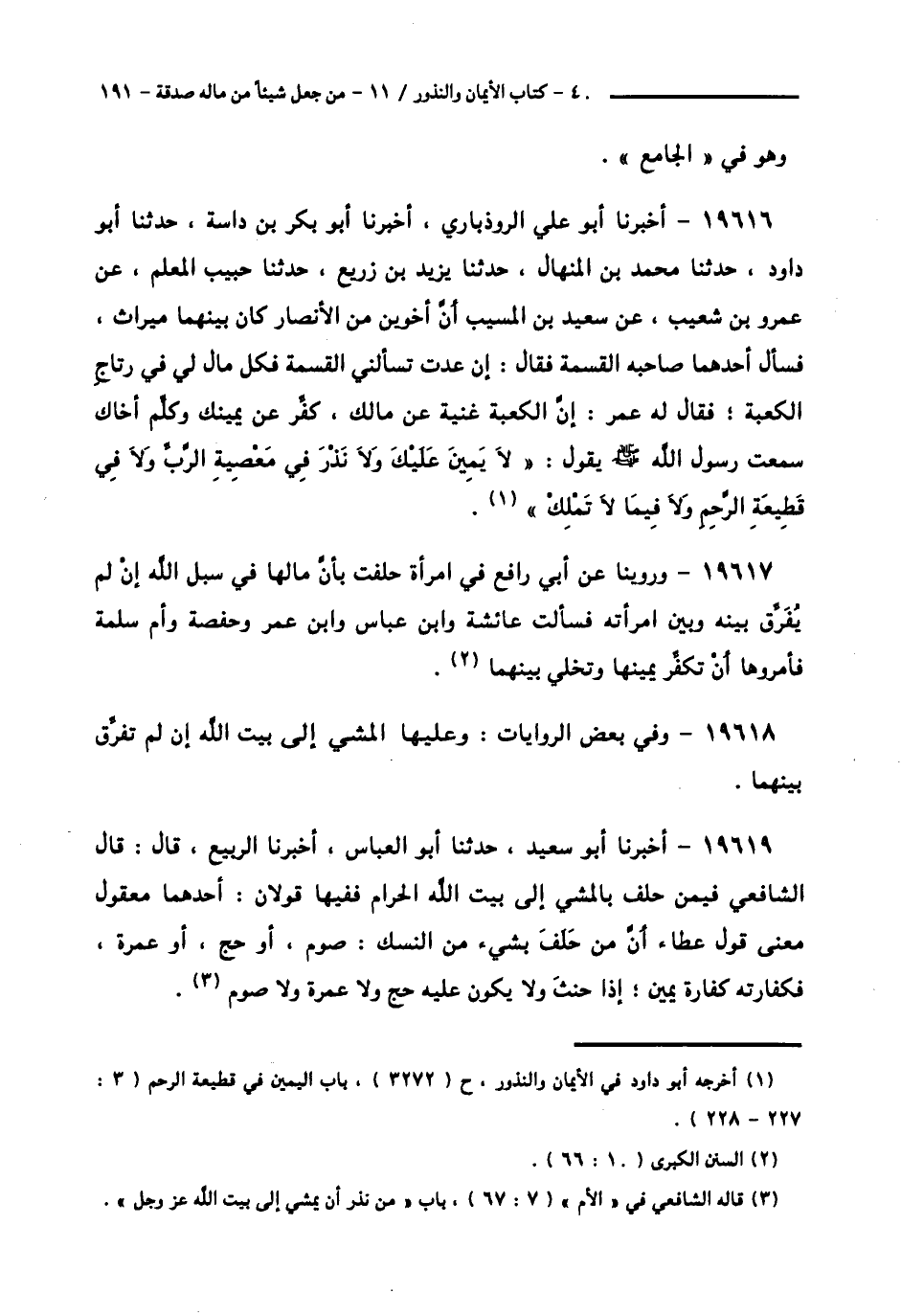 19616 - أَخْبَرَنَا أَبُو عَلِيٍّ الرُّوذْبَارِيُّ، أَخْبَرَنَا أَبُو بَكْرِ بْنُ دَاسَةَ، حَدَّثَنَا أَبُو دَاوُدَ، حَدَّثَنَا مُحَمَّدُ بْنُ الْمِنْهَالِ، حَدَّثَنَا يَزِيدُ بْنُ زُرَيْعٍ، حَدَّثَنَا حَبِيبٌ الْمُعَلِّمُ، عَنْ عَمْرِو بْنِ شُعَيْبٍ، عَنْ سَعِيدِ بْنِ الْمُسَيِّبِ، أَنَّ أَخَوَيْنِ مِنَ الْأَنْصَارِ كَانَ بَيْنَهُمَا مِيرَاثٌ، فَسَأَلَ أَحَدُهُمَا صَاحِبَهُ الْقِسْمَةَ، فَقَالَ: إِنْ عُدْتَ تَسْأَلُنِي الْقِسْمَةَ فَكُلُّ مَالٍ لِي فِي رِتَاجِ، الْكَعْبَةِ، فَقَالَ لَهُ عُمَرُ: إِنَّ الْكَعْبَةَ غَنِيَّةٌ عَنْ مَالِكٍ، كَفِّرْ عَنْ يَمِينِكَ وَكَلِّمْ أَخَاكَ، سَمِعْتُ رَسُولَ اللَّهِ صَلَّى اللهُ عَلَيْهِ وَسَلَّمَ يَقُولُ: «§لَا يَمِينَ عَلَيْكَ، وَلَا نَذْرَ فِي مَعْصِيَةِ الرَّبِّ، وَلَا فِي قَطِيعَةِ الرَّحِمِ، وَلَا فِيمَا لَا تَمْلِكُ»