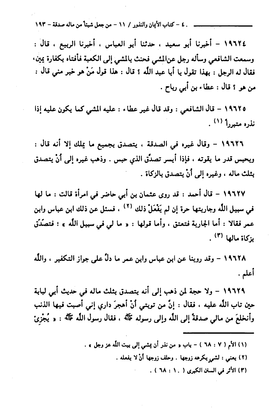 19624 - أَخْبَرَنَا أَبُو سَعِيدٍ، حَدَّثَنَا أَبُو الْعَبَّاسِ، أَخْبَرَنَا الرَّبِيعُ قَالَ: وَسَمِعْتُ الشَّافِعِيَّ، §وَسَأَلَهُ رَجُلٌ عَنِ الْمَشْيِ، فَحَنِثَ بِالْمَشْيِ إِلَى الْكَعْبَةِ، «فَأَفْتَاهُ بِكَفَّارَةِ يَمِينٍ»، فَقَالَ لَهُ الرَّجُلُ: بِهَذَا تَقُولُ يَا أَبَا عَبْدِ اللَّهِ؟ قَالَ: هَذَا قَوْلُ مَنْ هُوَ خَيْرٌ مِنِّي قَالَ: مَنْ هُوَ؟ قَالَ: عَطَاءُ بْنُ أَبِي رَبَاحٍ