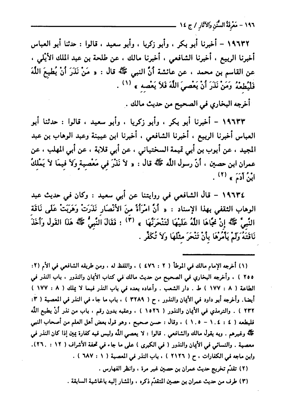 19632 - أَخْبَرَنَا أَبُو بَكْرٍ، وَأَبُو زَكَرِيَّا، وَأَبُو سَعِيدٍ، قَالُوا: حَدَّثَنَا أَبُو الْعَبَّاسِ، أَخْبَرَنَا الرَّبِيعُ، أَخْبَرَنَا الشَّافِعِيُّ، أَخْبَرَنَا مَالِكٌ، عَنْ طَلْحَةَ بْنِ عَبْدِ الْمَلِكِ الْأَيْلِيِّ، عَنِ الْقَاسِمِ بْنِ مُحَمَّدٍ، عَنْ عَائِشَةَ، أَنَّ النَّبِيَّ صَلَّى اللهُ عَلَيْهِ وَسَلَّمَ قَالَ: «§مَنْ نَذَرَ أَنْ يُطِيعَ اللَّهَ فَلْيُطِعْهُ، وَمَنْ نَذَرَ أَنْ يَعْصِيَ اللَّهَ فَلَا يَعْصِهِ»، أَخْرَجَهُ الْبُخَارِيُّ فِي الصَّحِيحِ، مِنْ حَدِيثِ مَالِكٍ
