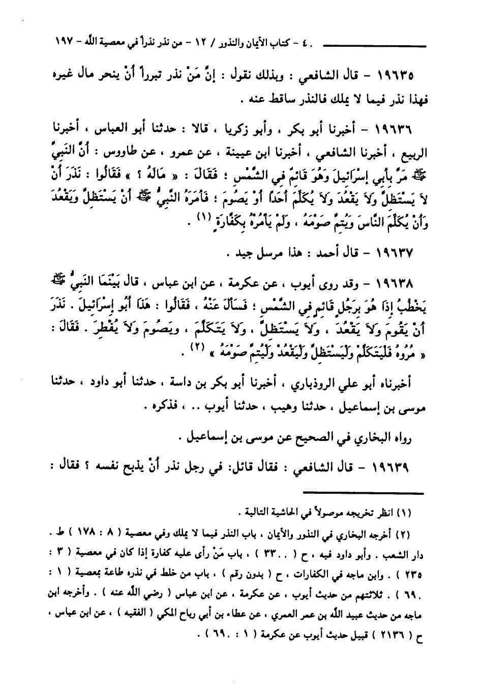 19636 - أَخْبَرَنَا أَبُو بَكْرٍ، وَأَبُو زَكَرِيَّا قَالَا: حَدَّثَنَا أَبُو الْعَبَّاسِ، أَخْبَرَنَا الرَّبِيعُ، أَخْبَرَنَا الشَّافِعِيُّ، أَخْبَرَنَا ابْنُ عُيَيْنَةَ، عَنْ عَمْرٍو، عَنْ طَاوُسٍ، أَنَّ النَّبِيَّ صَلَّى اللهُ عَلَيْهِ وَسَلَّمَ §مَرَّ بِأَبِي إِسْرَائِيلَ وَهُوَ قَائِمٌ فِي الشَّمْسِ، فَقَالَ: «مَا لَهُ؟»، فَقَالُوا: نَذَرَ أَنْ لَا يَسْتَظِلَّ، وَلَا يَقْعُدَ، وَلَا يُكَلِّمَ أَحَدًا، أَوْ يَصُومَ، فَأَمَرَهُ النَّبِيُّ صَلَّى اللهُ عَلَيْهِ وَسَلَّمَ أَنْ يَسْتَظِلَّ، وَيَقْعُدَ، وَأَنْ يُكَلِّمَ النَّاسَ، وَيُتِمَّ صَوْمَهُ، وَلَمْ يَأْمُرْهُ بِكَفَّارَةٍ