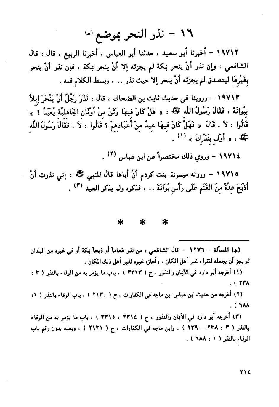 19713 - وَرُوِّينَا فِي حَدِيثِ ثَابِتِ بْنِ الضَّحَّاكِ قَالَ: نَذَرَ رَجُلٌ أَنْ يَنْحَرَ إِبِلًا بِبُوَانَةَ، فَقَالَ رَسُولُ اللَّهِ صَلَّى اللهُ عَلَيْهِ وَسَلَّمَ: «هَلْ كَانَ فِيهَا وَثَنٌ مِنْ أَوْثَانِ الْجَاهِلِيَّةِ يُعْبَدُ؟»، قَالُوا: لَا قَالَ: «فَهَلْ كَانَ فِيهَا عِيدٌ مِنْ أَعْيَادِهِمْ؟» قَالُوا: لَا، فَقَالَ رَسُولُ اللَّهِ صَلَّى اللهُ عَلَيْهِ وَسَلَّمَ: «أَوْفِ بِنَذْرِكَ»،