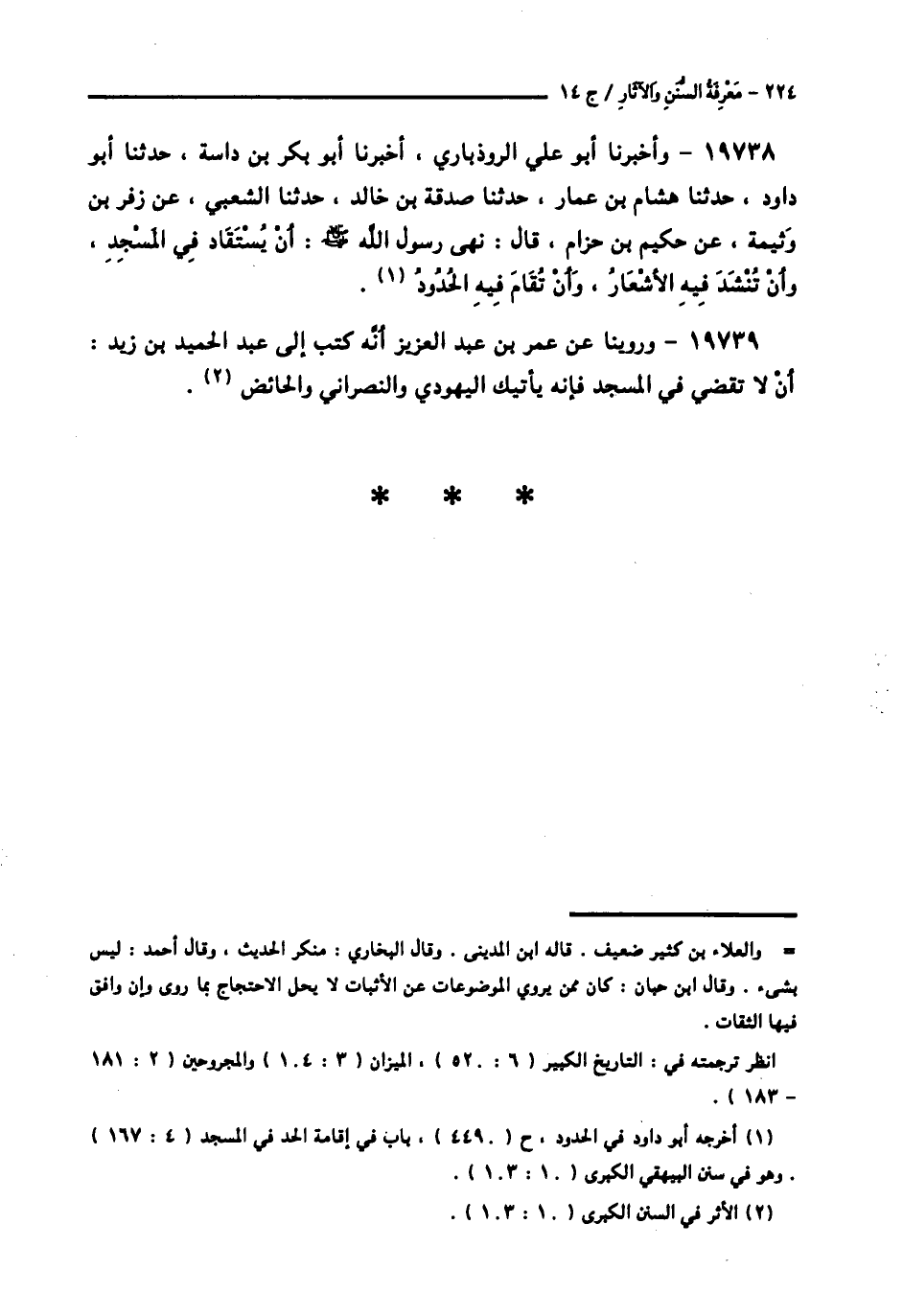 19738 - وَأَخْبَرَنَا أَبُو عَلِيٍّ الرُّوذْبَارِيُّ، أَخْبَرَنَا أَبُو بَكْرِ بْنُ دَاسَةَ، حَدَّثَنَا أَبُو دَاوُدَ، حَدَّثَنَا هِشَامُ بْنُ عَمَّارٍ، حَدَّثَنَا صَدَقَةُ بْنُ خَالِدٍ، حَدَّثَنَا الشَّعْبِيُّ، عَنْ زُفَرَ بْنِ وَثِيمَةَ، عَنْ حَكِيمِ بْنِ حِزَامٍ قَالَ: " §نَهَى رَسُولُ اللَّهِ صَلَّى اللهُ عَلَيْهِ وَسَلَّمَ: أَنْ يُسْتَقَادَ فِي الْمَسْجِدِ، وَأَنْ تُنْشَدَ فِيهِ الْأَشْعَارُ، وَأَنْ تُقَامَ فِيهِ الْحُدُودُ "