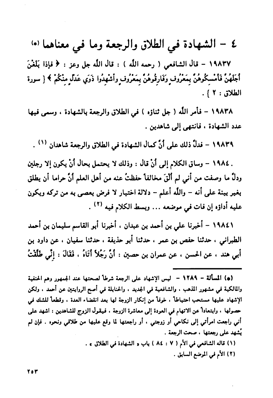 19838 - فَأَمَرَ اللَّهُ جَلَّ ثَنَاؤُهُ فِي الطَّلَاقِ وَالرَّجْعَةِ بِالشَّهَادَةِ، وَسَمَّى فِيهَا عَدَدَ الشَّهَادَةِ، فَانْتَهَى إِلَى شَاهِدَيْنِ،