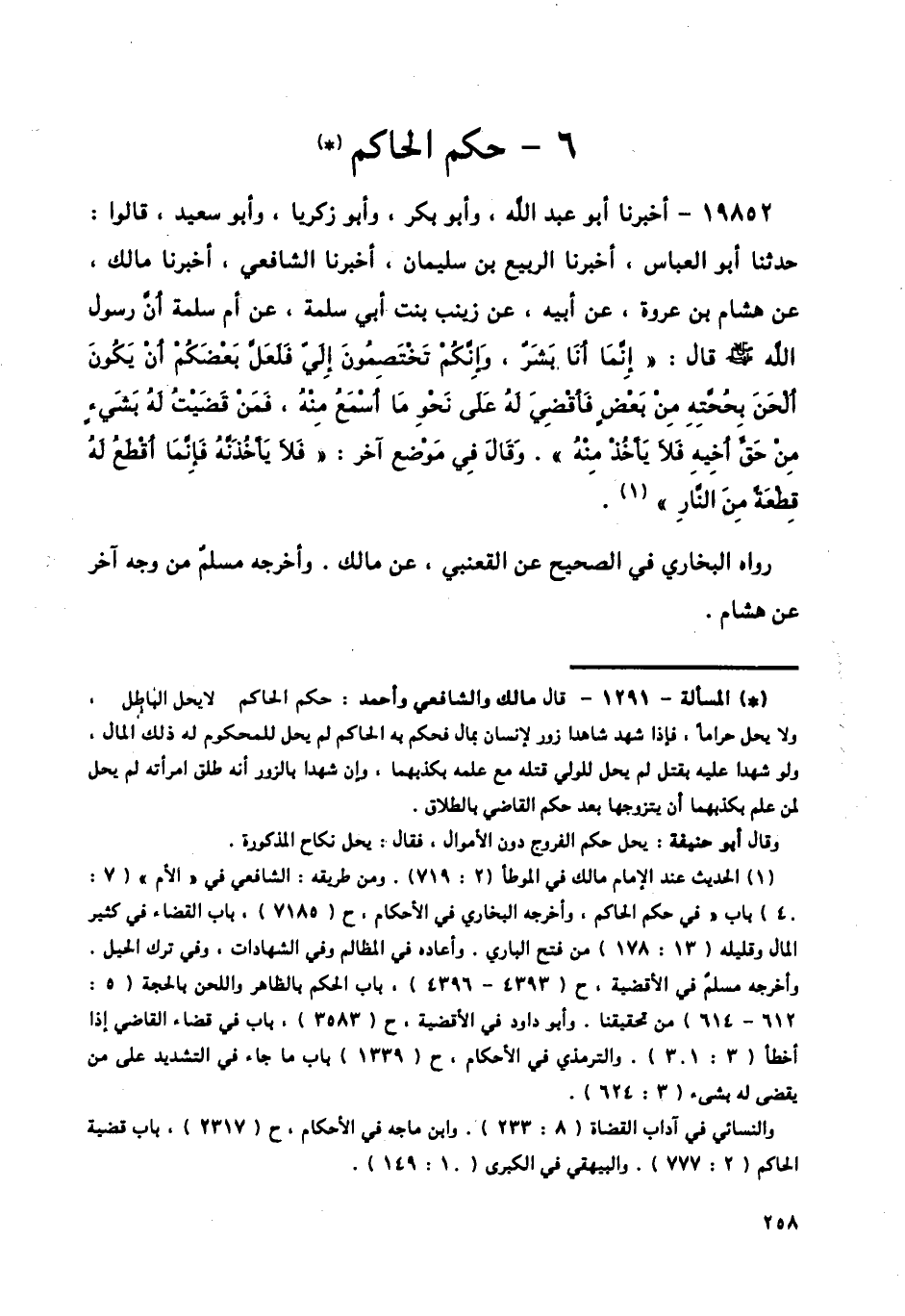 19852 - أَخْبَرَنَا أَبُو عَبْدُ اللَّهِ، وَأَبُو بَكْرٍ، وَأَبُو زَكَرِيَّا، وَأَبُو سَعِيدٍ، قَالُوا: حَدَّثَنَا أَبُو الْعَبَّاسِ، أَخْبَرَنَا الرَّبِيعُ بْنُ سُلَيْمَانَ، أَخْبَرَنَا الشَّافِعِيُّ، أَخْبَرَنَا مَالِكٌ، عَنْ هِشَامِ بْنِ عُرْوَةَ، عَنْ أَبِيهِ، عَنْ زَيْنَبَ بِنْتِ أَبِي سَلَمَةَ، عَنْ أُمِّ سَلَمَةَ، أَنَّ رَسُولَ اللَّهِ صَلَّى اللهُ عَلَيْهِ وَسَلَّمَ قَالَ: «§إِنَّمَا أَنَا بَشَرٌ، وَإِنَّكُمْ تَخْتَصِمُونَ إِلَيَّ فَلَعَلَّ بَعْضَكُمْ أَنْ يَكُونَ أَلْحَنَ بِحُحَّتِهِ مِنْ بَعْضٍ، فَأَقْضِيَ لَهُ عَلَى نَحْوِ مَا أَسْمَعُ مِنْهُ، فَمَنْ قَضَيْتُ لَهُ بِشَيْءٍ مِنْ حَقِّ أَخِيهِ فَلَا يَأْخُذْ مِنْهُ»، وَقَالَ فِي مَوْضِعٍ آخَرَ: «فَلَا يَأْخُذَنَّهُ، فَإِنَّمَا أَقْطَعُ لَهُ قِطْعَةً مِنَ النَّارِ»، رَوَاهُ الْبُخَارِيُّ فِي الصَّحِيحِ، عَنِ الْقَعْنَبِيِّ، عَنْ مَالِكٍ، وَأَخْرَجَهُ مُسْلِمٌ مِنْ وَجْهٍ آخَرَ، عَنْ هِشَامٍ -[259]-