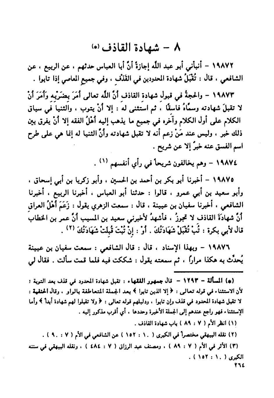 19875 - أَخْبَرَنَا أَبُو بَكْرِ بْنُ أَحْمَدَ بْنِ الْحُسَيْنِ، وَأَبُو زَكَرِيَّا بْنُ أَبِي إِسْحَاقَ، وَأَبُو سَعِيدِ بْنُ أَبِي عَمْرٍو، قَالُوا: حَدَّثَنَا أَبُو الْعَبَّاسِ، أَخْبَرَنَا الرَّبِيعُ، أَخْبَرَنَا الشَّافِعِيُّ، أَخْبَرَنَا سُفْيَانُ بْنُ عُيَيْنَةَ قَالَ: سَمِعْتُ الزُّهْرِيَّ، يَقُولُ: زَعَمَ أَهْلُ الْعِرَاقِ أَنَّ شَهَادَةَ الْقَاذِفِ لَا تَجُوزُ، فَأَشْهَدُ لَأَخْبَرَنِي سَعِيدُ بْنُ الْمُسَيِّبِ، أَنَّ عُمَرَ بْنَ الْخَطَّابِ قَالَ لِأَبِي بَكْرَةَ: «§تُبْ تُقْبَلْ شَهَادَتُكَ، أَوْ إِنْ تُبْتَ قُبِلَتْ شَهَادَتُكَ»