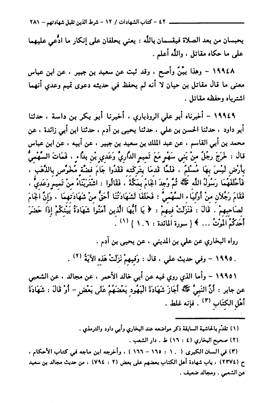 19949 - أَخْبَرَنَاهُ أَبُو عَلِيٍّ الرُّوذْبَارِيُّ، أَخْبَرَنَا أَبُو بَكْرِ بْنُ دَاسَةَ، حَدَّثَنَا أَبُو دَاوُدَ، حَدَّثَنَا الْحَسَنُ بْنُ عَلِيٍّ، حَدَّثَنَا يَحْيَى بْنُ آدَمَ، حَدَّثَنَا ابْنُ أَبِي زَائِدَةَ، عَنْ مُحَمَّدِ بْنِ أَبِي الْقَاسِمِ، عَنْ عَبْدِ الْمَلِكِ بْنِ سَعِيدِ بْنِ جُبَيْرٍ، عَنْ أَبِيهِ، عَنِ ابْنِ عَبَّاسٍ قَالَ: §" خَرَجَ رَجُلٌ مِنْ بَنِي سَهْمٍ مَعَ تَمِيمٍ الدَّارِيِّ وَعَدِيِّ بْنِ بَدَّاءٍ، فَمَاتَ السَّهْمِيُّ بِأَرْضٍ لَيْسَ بِهَا مُسْلِمٌ، فَلَمَّا قَدِمَا بِتَرِكَتِهِ فَقَدُوا جَامَ فِضَّةٍ مُخَوَّصٌ بِالذَّهَبِ، فَأَحْلَفَهُمَا رَسُولُ اللَّهِ صَلَّى اللهُ عَلَيْهِ وَسَلَّمَ، ثُمَّ وَجَدَ الْجَامَ بِمَكَّةَ، قَالُوا: اشْتَرَيْنَاهُ مِنْ تَمِيمٍ وَعَدِيٍّ، فَقَامَ رَجُلَانِ مِنْ أَوْلِيَاءِ السَّهْمِيِّ، فَحَلَفَا لَشَهَادَتُنَا أَحَقُّ مِنْ شَهَادَتِهِمَا، وَأَنَّ الْجَامَ لِصَاحِبِهِمْ قَالَ: فَنَزَلَتْ فِيهِمْ: {يَا أَيُّهَا الَّذِينَ آمَنُوا شَهَادَةُ بَيْنِكُمْ إِذَا حَضَرَ أَحَدَكُمُ الْمَوْتُ} [المائدة: 106] "، رَوَاهُ الْبُخَارِيُّ، عَنْ عَلِيِّ بْنِ الْمَدِينِيِّ، عَنْ يَحْيَى بْنِ آدَمَ،
