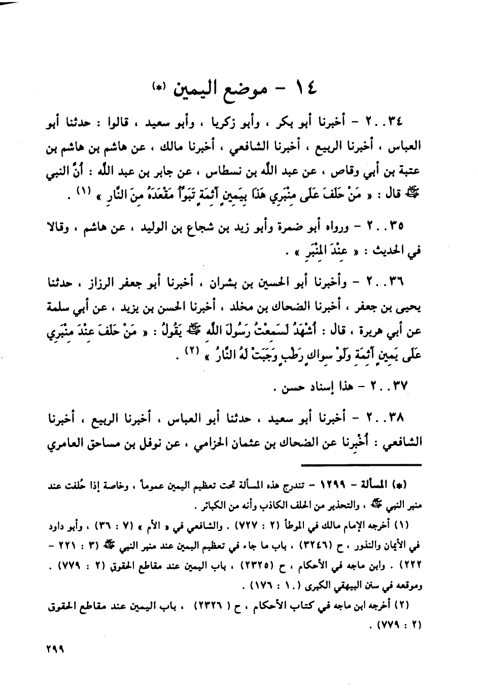 20034 - أَخْبَرَنَا أَبُو بَكْرٍ، وَأَبُو زَكَرِيَّا، وَأَبُو سَعِيدٍ، قَالُوا: حَدَّثَنَا أَبُو الْعَبَّاسِ، أَخْبَرَنَا الرَّبِيعُ، أَخْبَرَنَا الشَّافِعِيُّ، أَخْبَرَنَا مَالِكٌ، عَنْ هَاشِمِ بْنِ هَاشِمِ بْنِ عُتْبَةَ بْنِ أَبِي وَقَّاصٍ، عَنْ عَبْدِ اللَّهِ بْنِ نِسْطَاسٍ، عَنْ جَابِرِ بْنِ عَبْدِ اللَّهِ، أَنَّ النَّبِيَّ صَلَّى اللهُ عَلَيْهِ وَسَلَّمَ قَالَ: § «مَنْ حَلَفَ عَلَى مِنْبَرِي هَذَا بِيَمِينٍ آثِمَةٍ تَبَوَّأَ مَقْعَدَهُ مِنَ النَّارِ»،