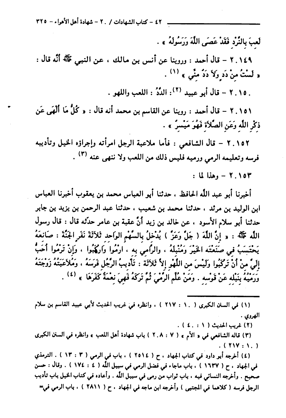 20153 - وَهَذَا لِمَا: أَخْبَرَنَا أَبُو عَبْدِ اللَّهِ الْحَافِظُ، حَدَّثَنَا أَبُو الْعَبَّاسِ مُحَمَّدُ بْنُ يَعْقُوبَ، أَخْبَرَنَا الْعَبَّاسُ بْنُ الْوَلِيدِ بْنِ مَزْيَدٍ، حَدَّثَنَا مُحَمَّدُ بْنُ شُعَيْبٍ، حَدَّثَنَا عَبْدُ الرَّحْمَنِ بْنُ يَزِيدَ بْنَ جَابِرٍ , حَدَّثَنَا أَبُو سَلَّامٍ الْأَسْوَدُ، عَنْ خَالِدِ بْنِ زَيْدٍ، أَنَّ عُقْبَةَ بْنَ عَامِرٍ حَدَّثَهُ قَالَ: قَالَ رَسُولُ اللَّهِ صَلَّى اللهُ عَلَيْهِ وَسَلَّمَ: " إِنَّ §اللَّهَ جَلَّ وَعَزَّ يُدْخِلُ بِالسَّهْمِ الْوَاحِدِ ثَلَاثَةَ نَفَرٍ الْجَنَّةَ: صَانِعَهُ يَحْتَسِبُ فِي صَنْعَتِهِ الْخَيْرَ، وَمُنْبِلَهُ، وَالرَّامِيَ بِهِ، ارْمُوا وَارْكَبُوا، وَأَنْ تَرْمُوا أَحَبُّ إِلَيَّ مِنْ أَنْ تَرْكَبُوا، وَلَيْسَ مِنَ اللَّهْوِ إِلَّا ثَلَاثَةٌ: تَأْدِيبُ الرَّجُلِ فَرَسَهُ، وَمُلَاعَبَتُهُ زَوْجَتَهُ، وَرَمْيُهُ بِنَبْلِهِ عَنْ قَوْسِهِ، وَمَنْ عَلِمَ الرَّمْيَ ثُمَّ تَرَكَهُ فَهِيَ نِعْمَةٌ كَفَرَهَا " -[326]-،