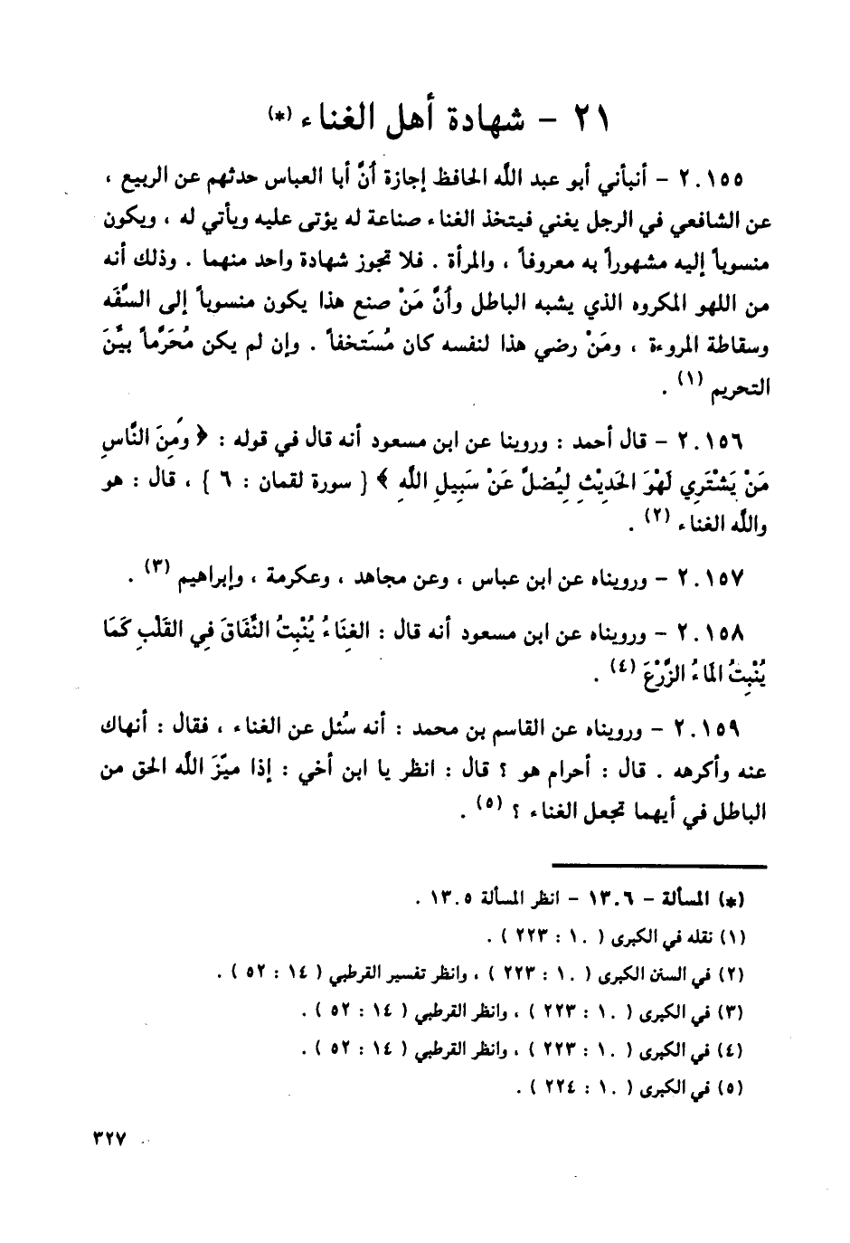 20155 - أَنْبَأَنِي أَبُو عَبْدِ اللَّهِ الْحَافِظُ، إِجَازَةً أَنَّ أَبَا الْعَبَّاسِ، حَدَّثَهُمْ عَنِ الرَّبِيعِ، عَنِ الشَّافِعِيِّ § «فِي الرَّجُلِ يُغَنِّي فَيَتَّخِذُ الْغِنَاءَ صِنَاعَةً لَهُ يُؤْتَى عَلَيْهِ وَيَأْتِي لَهُ، وَيَكُونُ مَنْسُوبًا إِلَيْهِ مَشْهُورًا بِهِ مَعْرُوفًا، وَالْمَرْأَةِ، فَلَا تَجُوزُ شَهَادَةُ وَاحِدٍ مِنْهُمَا، وَذَلِكَ أَنَّهُ مِنَ اللَّهْوِ الْمَكْرُوهِ الَّذِي يُشْبِهُ الْبَاطِلَ، وَأَنَّ مَنْ صَنَعَ هَذَا يَكُونُ مَنْسُوبًا إِلَى السَّفَهِ وَسَقَاطَةِ الْمُرُوءَةِ، وَمَنْ رَضِيَ هَذَا لِنَفْسِهِ كَانَ مُسْتَخِفًّا، وَإِنْ لَمْ يَكُنْ مُحَرَّمًا بَيِّنَ التَّحْرِيمِ»