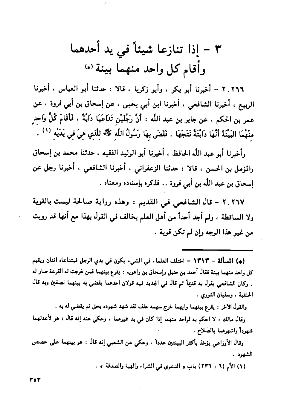 20266 - أَخْبَرَنَا أَبُو بَكْرٍ، وَأَبُو زَكَرِيَّا قَالَا: حَدَّثَنَا أَبُو الْعَبَّاسِ، أَخْبَرَنَا الرَّبِيعُ، أَخْبَرَنَا الشَّافِعِيُّ، أَخْبَرَنَا ابْنُ أَبِي يَحْيَى، عَنْ إِسْحَاقَ بْنِ أَبِي فَرْوَةَ، عَنْ عُمَرَ بْنِ الْحَكَمِ، عَنْ جَابِرِ بْنِ عَبْدِ اللَّهِ، أَنَّ «§رَجُلَيْنِ تَدَاعَيَا دَابَّةً، فَأَقَامَ كُلُّ وَاحِدٍ مِنْهُمَا الْبَيِّنَةَ أَنَّهَا دَابَّتُهُ نَتَجَهَا، فَقَضَى بِهَا رَسُولُ اللَّهِ صَلَّى اللهُ عَلَيْهِ وَسَلَّمَ لِلَّذِي هِيَ فِي يَدَيْهِ»، وَأَخْبَرَنَا أَبُو عَبْدِ اللَّهِ الْحَافِظُ، أَخْبَرَنَا أَبُو الْوَلِيدِ الْفَقِيهُ، حَدَّثَنَا مُحَمَّدُ بْنُ إِسْحَاقَ، وَالْمُؤَمَّلُ بْنُ الْحَسَنِ قَالَا: حَدَّثَنَا الزَّعْفَرَانِيُّ، أَخْبَرَنَا الشَّافِعِيُّ، أَخْبَرَنَا رَجُلٌ، عَنْ إِسْحَاقَ بْنِ عَبْدِ اللَّهِ بْنِ أَبِي فَرْوَةَ، فَذَكَرَهُ بِإِسْنَادِهِ وَمَعْنَاهُ