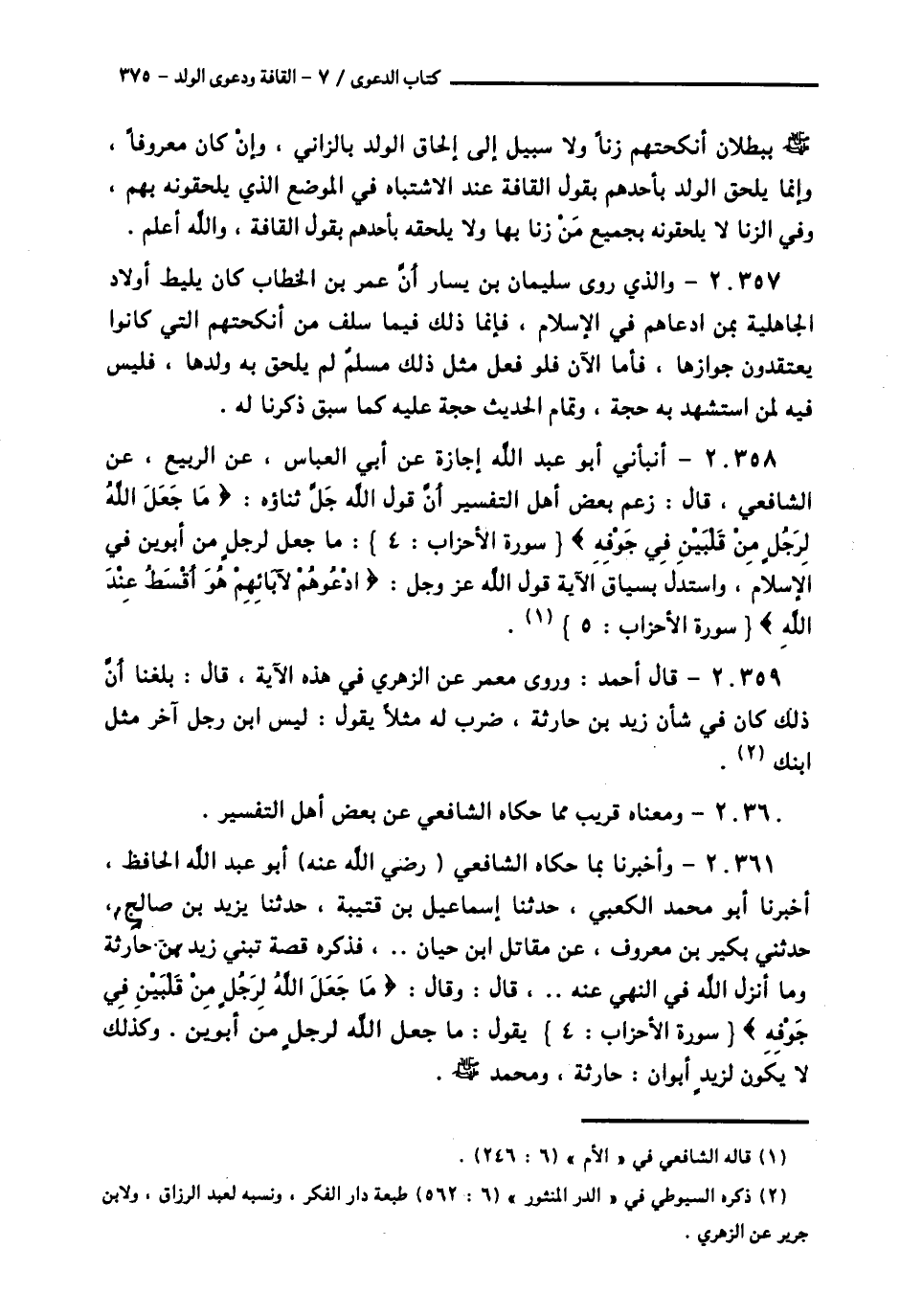 20358 - أَنْبَأَنِي أَبُو عَبْدِ اللَّهِ، إِجَازَةً عَنْ أَبِي الْعَبَّاسِ، عَنِ الرَّبِيعِ، عَنِ الشَّافِعِيِّ قَالَ: زَعَمَ بَعْضُ أَهْلِ التَّفْسِيرِ أَنَّ قَوْلَ اللَّهِ جَلَّ ثَنَاؤُهُ: {§مَا جَعَلَ اللَّهُ لِرَجُلٍ مِنْ قَلْبَيْنِ فِي جَوْفِهِ} [الأحزاب: 4]: مَا جَعَلَ لِرَجُلٍ مِنْ أَبَوَيْنِ فِي الْإِسْلَامِ، وَاسْتَدَلَّ بِسِيَاقِ الْآيَةِ قَوْلِ اللَّهِ عَزَّ وَجَلَّ: {ادْعُوهُمْ لِآبَائِهِمْ هُوَ أَقْسَطُ عِنْدَ اللَّهِ} [الأحزاب: 5] "