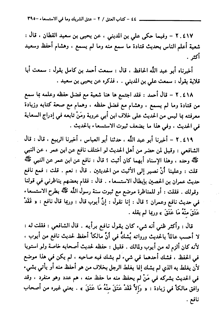 20419 - أَخْبَرَنَا أَبُو عَبْدِ اللَّهِ، حَدَّثَنَا أَبُو الْعَبَّاسِ، أَخْبَرَنَا الرَّبِيعُ قَالَ: قَالَ الشَّافِعِيُّ: " وَقِيلَ لِمَنْ حَضَرَ مِنْ أَهْلِ الْحَدِيثِ: §لَوِ اخْتَلَفَ نَافِعٌ، عَنِ ابْنِ عُمَرَ، عَنِ النَّبِيِّ صَلَّى اللهُ عَلَيْهِ وَسَلَّمَ وَحْدَهُ، وَهَذَا الْإِسْنَادُ أَيُّهُمَا كَانَ أَثْبَتَ؟ " قَالَ: نَافِعٌ، عَنِ ابْنِ عُمَرَ، عَنِ النَّبِيِّ صَلَّى اللهُ عَلَيْهِ وَسَلَّمَ. قُلْتُ: «وَعَلَيْنَا أَنْ نَصِيرَ إِلَى الْأَثْبَتِ مِنَ الْحَدِيثَيْنِ» قَالَ: نَعَمْ. قُلْتُ: «فَمَعَ نَافِعٍ حَدِيثُ عِمْرَانَ بْنِ الْحُصَيْنِ بِإِبْطَالِ الِاسْتِسْعَاءِ» قَالَ: فَقَامَ بَعْضُهُمْ يُنَاظِرُنِي فِي قَوْلِنَا، وَقَوْلِكَ. فَقُلْتُ: «أَوَلِلْمُنَاظَرَةِ مَوْضِعٌ مَعَ ثُبُوتِ سُنَّةِ رَسُولِ اللَّهِ صَلَّى اللهُ عَلَيْهِ وَسَلَّمَ، بِطَرْحِ الِاسْتِسْعَاءِ فِي حَدِيثِ نَافِعٍ، وَعِمْرَانَ؟» قَالَ: إِنَّا نَقُولُ: إِنَّ أَيُّوبَ قَالَ: وَرُبَّمَا قَالَ نَافِعٌ: «فَقَدْ عَتَقَ مِنْهُ مَا عَتَقَ» وَرُبَّمَا لَمْ يَقُلْهُ قَالَ: وَأَكْثَرُ ظَنِّي أَنَّهُ شَيْءٌ كَانَ يَقُولُ نَافِعٌ بِرَأْيِهِ , قَالَ الشَّافِعِيُّ: " فَقُلْتُ لَهُ: لَا أَحْسِبُ عَالِمًا بِالْحَدِيثِ وَرُوَاتِهِ يَشُكُّ فِي أَنَّ مَالِكًا أَحْفَظُ لِحَدِيثِ نَافِعٍ مِنْ أَيُّوبَ؛ لِأَنَّهُ كَانَ أَلْزَمَ لَهُ مِنْ أَيُّوبَ، وَلِمَالِكٍ. فَقِيلَ: حِفْظُهُ لِحَدِيثِ أَصْحَابِهِ خَاصَّةً وَلَوِ اسْتَوَيَا فِي الْحِفْظِ فَشَكَّ أَحَدُهُمَا فِي شَيْءٍ لَمْ يَشُكَّ فِيهِ صَاحِبُهُ، لَمْ يَكُنْ فِي هَذَا مَوْضِعٌ لِأَنْ يُغَلَّطَ بِهِ الَّذِي لَمْ يَشُكَّ إِنَّمَا يُغَلَّطُ الرَّجُلُ بِخِلَافِ مَنْ هُوَ أَحْفَظُ مِنْهُ أَوْ يَأْتِي بِشَيْءٍ فِي الْحَدِيثِ يُشْرِكُهُ فِي مَنْ لَمْ يَحْفَظْ مِنْهُ مَا حَفِظَ مِنْهُ، هُمْ عَدَدٌ وَهُوَ مُنْفَرِدٌ، قَدْ وَافَقَ مَالِكًا فِي زِيَادَةٍ: وَإِلَّا فَقَدْ عَتَقَ مِنْهُ مَا عَتَقَ ". يَعْنِي غَيْرَهُ مِنْ أَصْحَابِ نَافِعٍ -[396]-. قَالَ الشَّافِعِيُّ: وَزَادَ بَعْضُهُمْ: «وَرَقَّ مِنْهُ مَا رَقَّ»