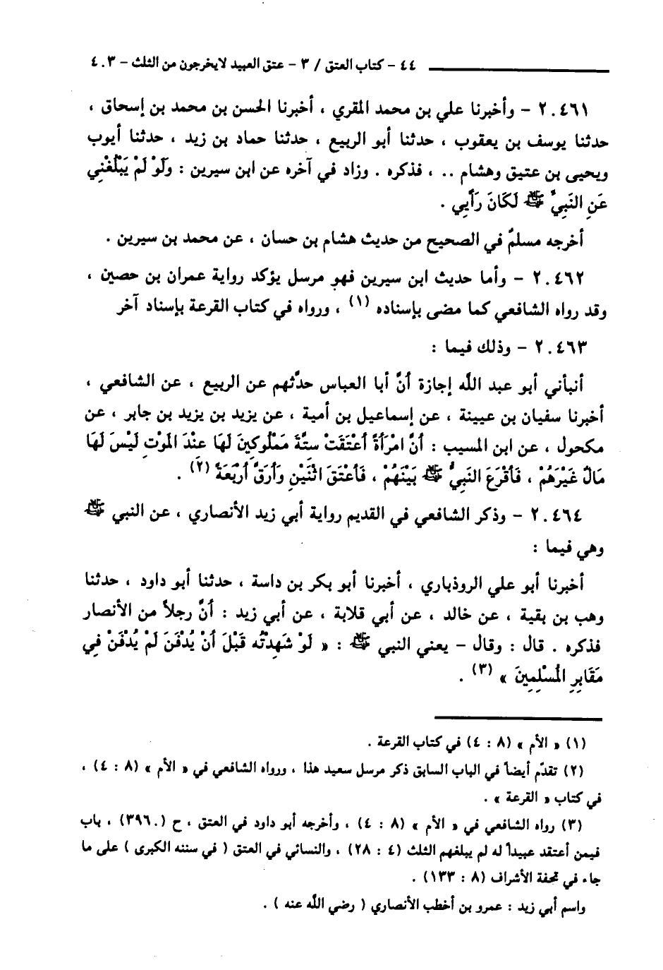 20463 - وَذَلِكَ فِيمَا: أَنْبَأَنِي أَبُو عَبْدِ اللَّهِ إِجَازَةً، أَنَّ أَبَا الْعَبَّاسِ، حَدَّثَهُمْ عَنِ الرَّبِيعِ، عَنِ الشَّافِعِيِّ، أَخْبَرَنَا سُفْيَانُ بْنُ عُيَيْنَةَ، عَنْ إِسْمَاعِيلَ بْنِ أُمَيَّةَ، عَنْ يَزِيدَ بْنَ يَزِيدَ بْنِ جَابِرٍ، عَنْ مَكْحُولٍ، عَنِ ابْنِ الْمُسَيِّبِ: أَنَّ امْرَأَةً، أَعْتَقَتْ سِتَّةَ مَمْلُوكِينَ لَهَا عِنْدَ الْمَوْتِ لَيْسَ لَهَا مَالٌ غَيْرُهُمْ، فَأَقْرَعَ النَّبِيُّ صَلَّى اللهُ عَلَيْهِ وَسَلَّمَ بَيْنَهُمْ: § «فَأَعْتَقَ اثْنَيْنِ وَأَرَقَّ أَرْبَعَةً»