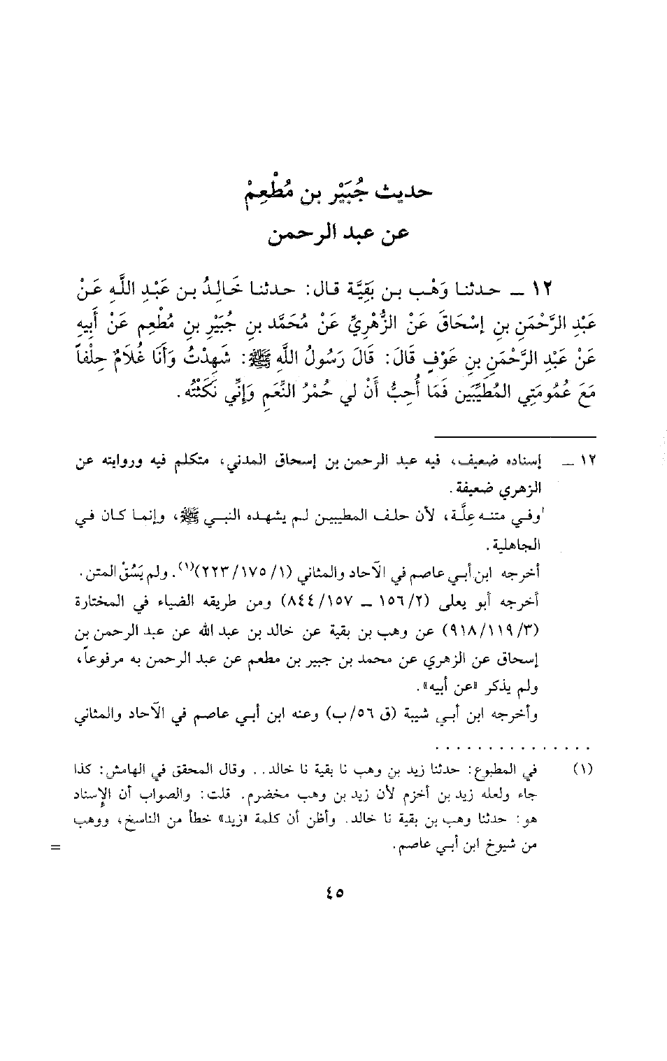 12 - حَدَّثَنَا وَهْبُ بْنُ بَقِيَّةَ، قَالَ: حَدَّثَنَا خَالِدُ بْنُ عَبْدِ اللَّهِ، عَنْ عَبْدِ الرَّحْمَنِ بْنِ إِسْحَاقَ، عَنِ الزُّهْرِيِّ، عَنْ مُحَمَّدِ بْنِ جُبَيْرِ بْنِ مُطْعِمٍ عَنِ أَبِيهِ، عَنْ عَبْدِ الرَّحْمَنِ بْنِ عَوْفٍ، قَالَ: قَالَ رَسُولُ اللَّهِ صَلَّى اللهُ عَلَيْهِ وَسَلَّمَ: §شَهِدْتُ وَأَنَا غُلَامٌ، حِلْفًا مَعَ عُمُومَتِي الْمُطَيَّبِينَ فَمَا أُحِبُّ أَنْ لِي حُمْرَ النَّعَمِ وَإِنِّي نَكَثْتُهُ