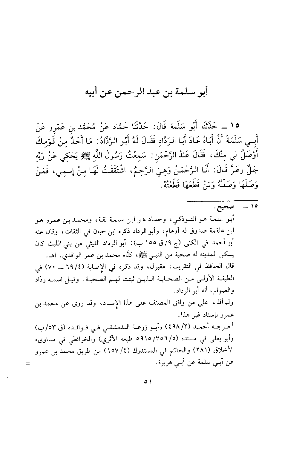 15 - حَدَّثَنَا أَبُو سَلَمَةَ، قَالَ: حَدَّثَنَا حَمَّادٌ، عَنْ مُحَمَّدِ بْنِ عَمْرٍو، عَنِ أَبِي سَلَمَةَ، أَنَّ أَبَاهُ، عَادَ أَبَا الرَّدَّادِ فَقَالَ لَهُ أَبُو الرَّدَّادِ: مَا أَحَدٌ مِنْ قَوْمَكِ أَوْصَلُ لِي مِنْكَ، فَقَالَ عَبْدُ الرَّحْمَنِ: سَمِعْتُ رَسُولَ اللَّهِ صَلَّى اللهُ عَلَيْهِ وَسَلَّمَ يَحْكِي عَنْ رَبِّهِ جَلَّ وَعَزَّ " قَالَ: §أَنَا الرَّحْمَنُ وَهِيَ الرَّحِمُ اشْتَقَقْتُ لَهَا مِنَ اسْمِي، فَمَنْ وَصَلَهَا وَصَلْتُهُ وَمَنْ قَطَعَهَا قَطَعْتُهُ "