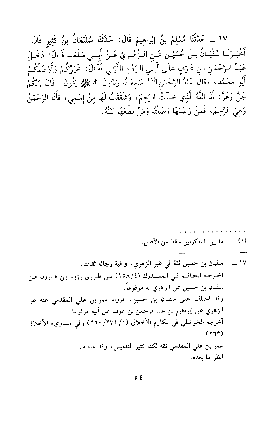 17 - حَدَّثَنَا مُسْلِمُ بْنُ إِبْرَاهِيمَ، قَالَ: حَدَّثَنَا سُلَيْمَانُ بْنُ كَثِيرٍ، قَالَ: أَخْبَرَنَا سُفْيَانُ بْنُ حُسَيْنٍ، عَنِ الزُّهْرِيِّ، عَنْ أَبِي سَلَمَةَ، قَالَ: دَخَلَ عَبْدُ الرَّحْمَنِ بْنُ عَوْفٍ عَلَى أَبِي الرَّدَّادِ اللَّيْثِيِّ فَقَالَ: خَيْرُكُمْ وَأَوْصَلَكُمْ أَبُو مُحَمَّدٍ، قَالَ عَبْدُ الرَّحْمَنِ: سَمِعْتُ رَسُولَ اللَّهِ صَلَّى اللهُ عَلَيْهِ وَسَلَّمَ يَقُولُ: «§قَالَ رَبُّكُمْ جَلَّ وَعَزَّ أَنَا اللَّهُ الَّذِي خَلَقْتُ الرَّحِمَ وَشَقَقْتُ لَهَا مِنَ اسْمِي، فَأَنَا الرَّحْمَنُ وَهِيَ الرَّحِمُ فَمَنْ وَصَلَهَا وَصَلْتُهُ وَمَنْ قَطَعَهَا بَتَتُّهُ»