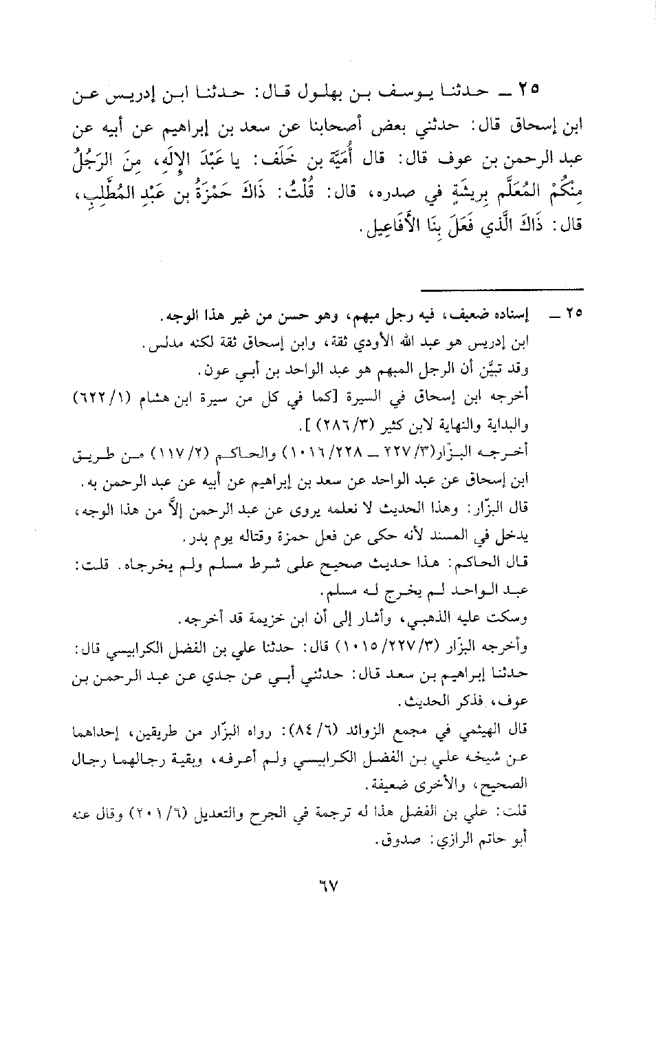 25 - حَدَّثَنَا يُوسُفُ بْنُ بَهْلُولٍ، قَالَ: حَدَّثَنَا ابْنُ إِدْرِيسَ، عَنِ ابْنِ إِسْحَاقَ، قَالَ: حَدَّثَنِي بَعْضُ أَصْحَابِنَا عَنْ سَعْدِ بْنِ إِبْرَاهِيمَ، عَنْ أَبِيهِ، عَنْ عَبْدِ الرَّحْمَنِ بْنِ عَوْفٍ، قَالَ: قَالَ أُمَيَّةُ بْنُ خَلَفٍ: يَا عَبْدَ الْإِلَهِ، مَنِ الرَّجُلُ مِنْكُمُ الْمُعَلَّمُ بِرِيشَةٍ فِي صَدْرِهِ؟ قَالَ: قُلْتُ «§ذَاكَ حَمْزَةُ بْنُ عَبْدِ الْمُطَّلِبِ» ، قَالَ: ذَاكَ الَّذِي فَعَلَ بِنَا الْأَفَاعِيلُ