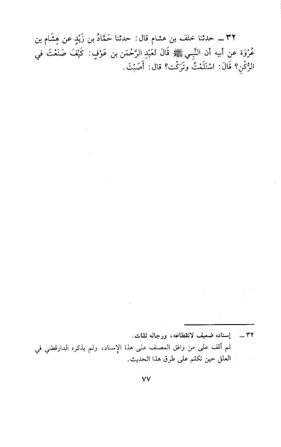 32 - حَدَّثَنَا خَلْفُ بْنُ هِشَامٍ، قَالَ: حَدَّثَنَا حَمَّادُ بْنُ زَيْدٍ، عَنْ هِشَامِ بْنِ عُرْوَةَ، عَنْ أَبِيهِ، أَنَّ النَّبِيَّ صَلَّى اللَّهُ عَلَيْهِ وَسَلَّم قَالَ لِعَبْدِ الرَّحْمَنِ بْنِ عَوْفٍ: §كَيْفَ صَنَعْتَ فِي الرُّكْنِ؟ قَالَ: اسْتَلَمْتُ وَتَرَكَتُ، قَالَ: أَصَبْتَ