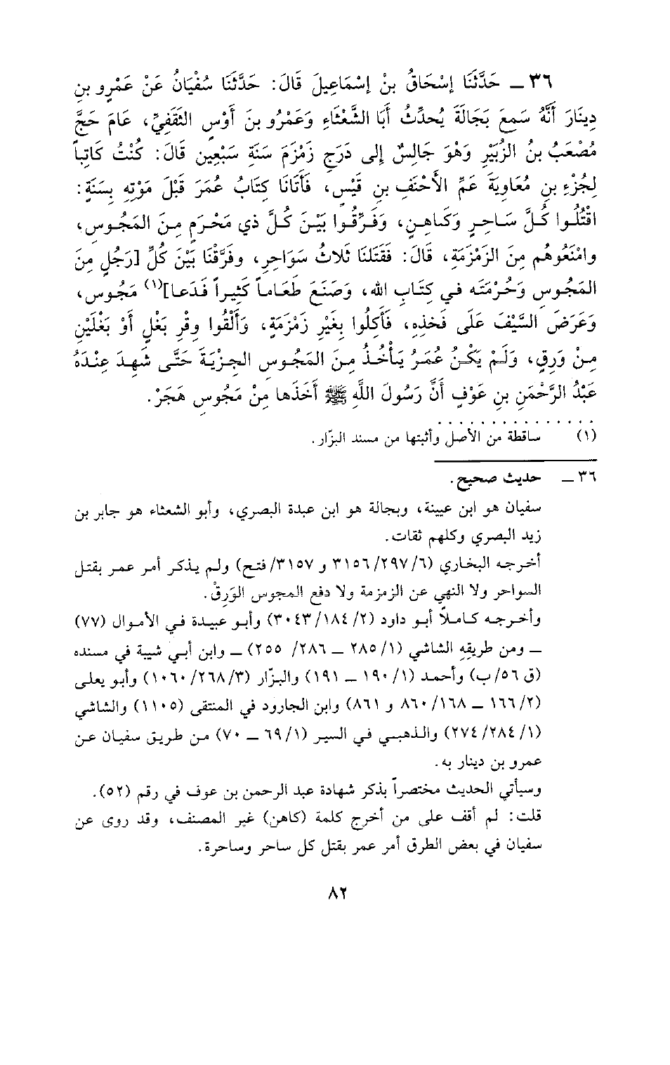 36 - حَدَّثَنَا إِسْحَاقُ بْنُ إِسْمَاعِيلَ، قَالَ: حَدَّثَنَا سُفْيَانُ، عَنْ عَمْرِو بْنِ دِينَارٍ، أَنَّهُ سَمِعَ بَجَالَةَ، يُحَدِّثُ أَبَا الشَّعْثَاءِ وَعَمْرَو بْنَ أَوْسٍ الثَّقَفِيَّ عَامَ حَجِّ مُصْعَبِ بْنِ الزُّبَيْرِ وَهُوَ جَالِسٌ إِلَى دَرَجِ زَمْزَمَ سَنَةَ سَبْعِينَ قَالَ: كُنْتُ كَاتِبًا لِجَزْءِ بْنِ مُعَاوِيَةَ عَمِّ الْأَحْنَفِ بْنِ قَيْسٍ، فَأَتَانَا كِتَابُ عُمَرَ قَبْلَ مَوْتِهِ بِسَنَةٍ §اقْتُلُوا كُلَّ سَاحِرٍ وَكَاهِنٍ، وَفَرِّقُوا بَيْنَ كُلِّ ذِي مُحْرِمٍ مِنَ الْمَجُوسِ، وَامْنَعُوهُمْ مِنَ الزَّمْزَمَةِ، قَالَ: فَقَتَلْنَا ثَلَاثَةَ سَوَاحِرَ، وَفَرَّقْنَا بَيْنَ كُلِّ رَجُلٍ مِنَ الْمَجُوسِ وَحُرْمَتِهِ فِي كِتَابِ اللَّهِ وَصَنَعَ طَعَامًا كَثِيرًا فَدَعَا مَجُوسَ وَعَرَضَ السَّيْفَ عَلَى فَخِذِهِ فَأَكَلُوا بِغَيْرِ زَمْزَمَةٍ وَأَلْقُوا وَقْرَ بَغْلٍ أَوْ بَغْلَيْنِ مِنْ وَرِقٍ وَلَمْ يَكُنْ عُمَرُ يَأْخُذُ مِنَ الْمَجُوسِ الْجِزْيَةِ حَتَّى شَهِدَ عِنْدَهُ عَبْدُ الرَّحْمَنِ بْنُ عَوْفٍ أَنَّ رَسُولَ اللَّهِ صَلَّى اللَّهُ عَلَيْهِ وَسَلَّم أَخَذَهَا مِنْ مَجُوسِ هَجَرَ