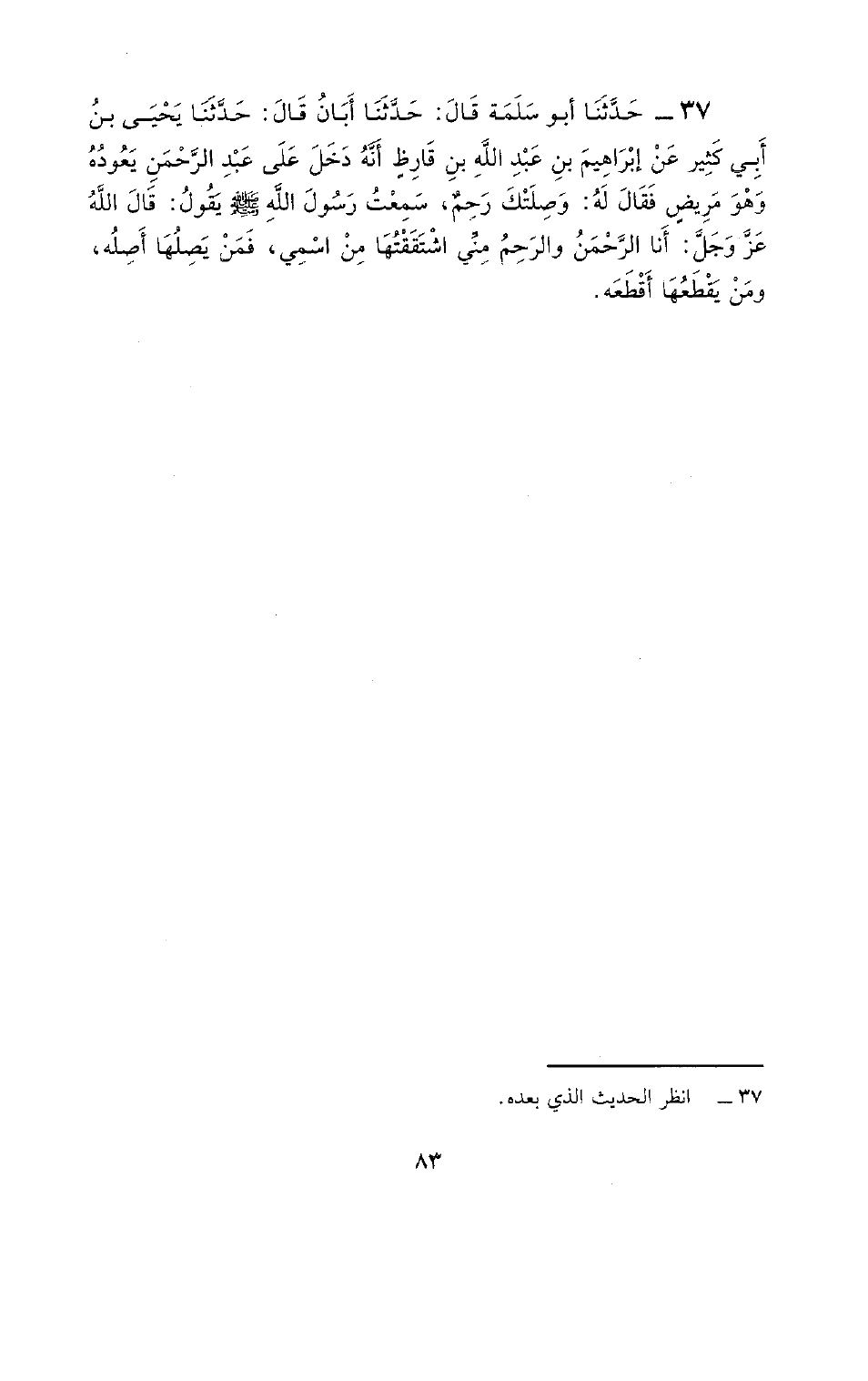 37 - حَدَّثَنَا أَبُو سَلَمَةَ، قَالَ: حَدَّثَنَا أَبَانُ، قَالَ: حَدَّثَنَا يَحْيَى بْنُ أَبِي كَثِيرٍ، عَنْ إِبْرَاهِيمَ بْنِ عَبْدِ اللَّهِ بْنِ قَارِظٍ، أَنَّهُ دَخَلَ عَلَى عَبْدِ الرَّحْمَنِ يَعُودُهُ وَهُوَ مَرِيضٌ فَقَالَ لَهُ: وَصَلَتْكَ رَحِمٌ سَمِعْتُ رَسُولَ اللَّهِ صَلَّى اللَّهُ عَلَيْهِ وَسَلَّم يَقُولُ: قَالَ اللَّهُ عَزَّ وَجَلَّ: «§أَنَا الرَّحْمَنُ وَالرَّحِمُ مِنِّي اشْتَقَقْتُهَا مِنَ اسْمِي فَمَنْ يَصِلْهَا أَصِلْهُ وَمَنْ يَقْطَعْهَا أَقْطَعْهُ»