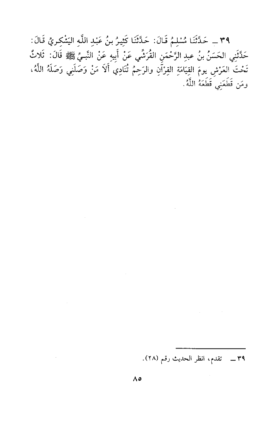 39 - حَدَّثَنَا مُسْلِمٌ، قَالَ: حَدَّثَنَا كَثِيرُ بْنُ عَبْدِ اللَّهِ الْيَشْكُرِيُّ، قَالَ: حَدَّثَنِي الْحَسَنُ بْنُ عَبْدِ الرَّحْمَنِ الْقُرَشِيُّ، عَنْ أَبِيهِ، عَنِ النَّبِيِّ صَلَّى اللَّهُ عَلَيْهِ وَسَلَّم قَالَ: «§ثَلَاثٌ تَحْتَ الْعَرْشِ يَومَ الْقِيَامَةِ، الْقُرْآنُ وَالرَّحِمُ تُنَادِي أَلَا مَنْ وَصَلَنِي وَصَلَهُ اللَّهُ، وَمَنْ قَطَعَنِي قَطَعَهُ اللَّهُ»