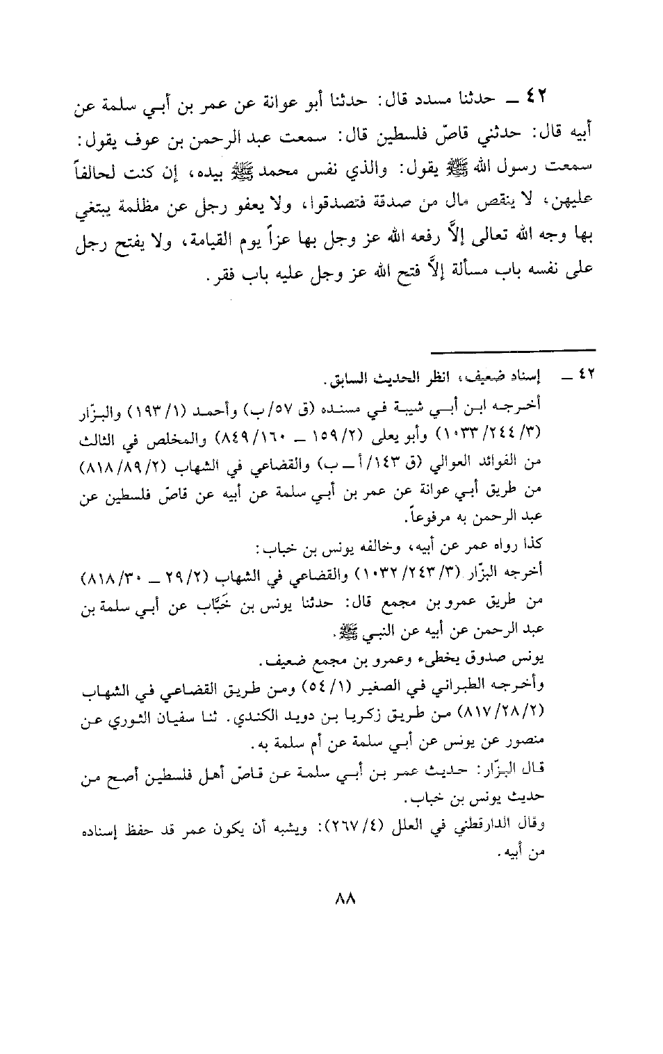 42 - حَدَّثَنَا مُسَدَّدٌ، قَالَ حَدَّثَنَا أَبُو عَوَانَةَ، عَنْ عُمَرَ بْنِ أَبِي سَلَمَةَ، عَنْ أَبِيهِ، قَالَ: حَدَّثَنِي قَاصُّ فِلَسْطِينَ قَالَ: سَمِعْتُ عَبْدَ الرَّحْمَنِ بْنَ عَوْفٍ، يَقُولُ: سَمِعْتُ رَسُولَ اللَّهِ صَلَّى اللَّهُ عَلَيْهِ وَسَلَّم يَقُولُ: «وَالَّذِي نَفْسُ مُحَمَّدٍ صَلَّى اللَّهُ عَلَيْهِ وَسَلَّم بِيَدِهِ إِنْ كُنْتُ لَحَالِفًا عَلَيْهِنَّ §لَا يَنْقُصُ مَالٌ مِنْ صَدَقَةٍ فَتَصَدَّقُوا، وَلَا يَعْفُو رَجُلٌ عَنْ مَظْلَمَةٍ يَبْتَغِي بِهَا وَجْهَ اللَّهِ تَعَالَى إِلَّا رَفَعَهُ اللَّهُ عَزَّ وَجَلَّ بِهَا عِزًّا يَومَ الْقِيَامَةِ، وَلَا يَفْتَحُ رَجُلٌ عَلَى نَفْسِهِ بَابَ مَسْأَلَةٍ إِلَّا فَتْحَ اللَّهُ عَزَّ وَجَلَّ عَلَيْهِ بَابَ فَقْرٍ»