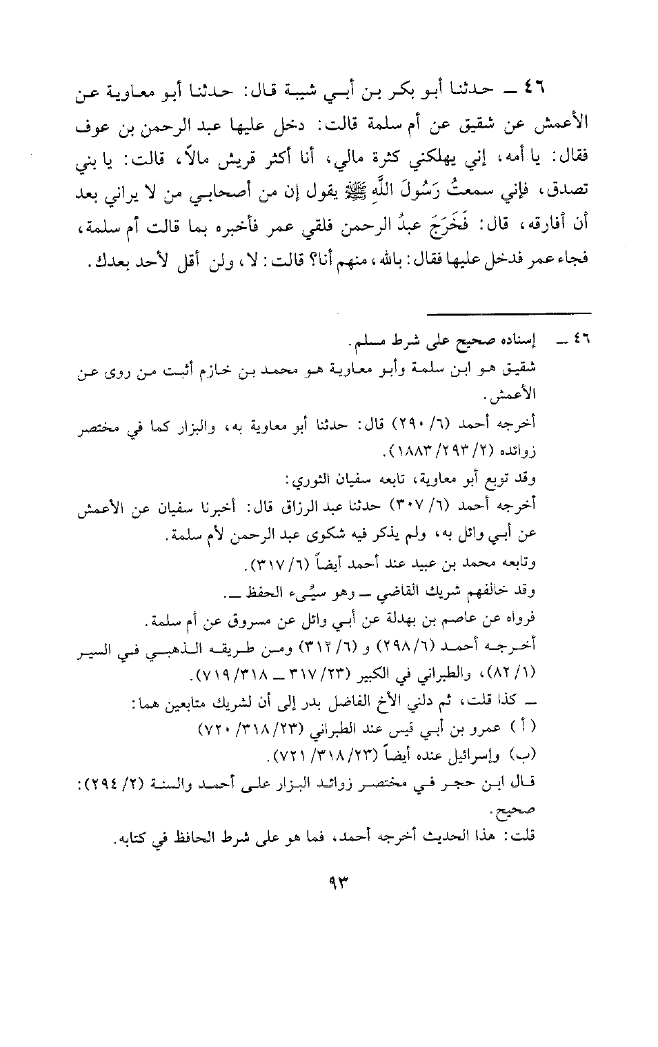 46 - حَدَّثَنَا أَبُو بَكْرِ بْنُ أَبِي شَيْبَةَ، قَالَ: حَدَّثَنَا أَبُو مُعَاوِيَةَ، عَنِ الْأَعْمَشِ، عَنْ شَقِيقٍ، عَنْ أُمِّ سَلَمَةَ، قَالَتْ: دَخَلَ عَلَيْهَا عَبْدُ الرَّحْمَنِ بْنُ عَوْفٍ، فَقَالَ: يَا أُمَّه، إِنِّي يُهْلِكُنِي كَثْرَةُ مَالِي أَنَا أَكْثَرُ قُرَيْشٍ مَالًا، قَالَتْ: يَا بُنَيَّ، تَصَدَّقْ، فَإِنِّي سَمِعْتُ رَسُولَ اللَّهِ صَلَّى اللَّهُ عَلَيْهِ وَسَلَّم يَقُولُ: «إِنَّ §مِنْ أَصْحَابِي مَنْ لَا يَرَانِي بَعْدَ أَنْ أُفَارِقَهُ» ، قَالَ: فَخَرَجَ عَبْدُ الرَّحْمَنِ فَلَقِيَ عُمَرَ فَأَخْبَرَهُ بِمَا قَالَتْ أُمُّ سَلَمَةَ، فَجَاءَ عُمَرُ فَدَخَلَ عَلَيْهَا فَقَالَ: بِاللَّهِ مِنْهُمْ أَنَا؟ قَالَتْ: لَا وَلَنْ أَقُولَ لِأَحَدٍ بَعْدَكَ