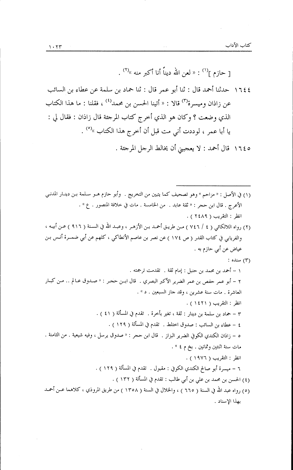 حدثنا أحمد قال: ثنا أبو عمر قال: ثنا حماد بن سلمة، عن عطاء بن السائب، عن زاذان وميسرة قالا: أتينا الحسن بن محمد فقلنا: ما هذا الكتاب الذي ضعت - وكان هو الذي أخرج كتاب المرجئة؟ قال زاذان: فقال لي: يا أبا عمر لوددت أني مت قبل أن أخرج هذا الكتاب.