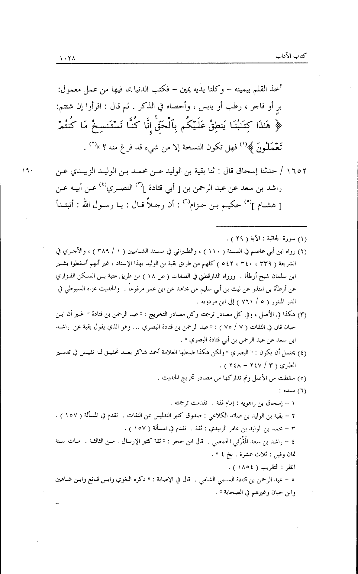 أخذ القلم بيمينه وكلتا يديه يمين فكتب: الدنيا بما فيها من عمل معمول برٌ أو فاجر، رطبٌ أو يابس، وأحصاه في الذكر ثم قال: اقرءوا إن شئتم: {هَذَا كِتَابُنَا يَنطِقُ عَلَيْكُم بِالْحَقِّ إِنَّا كُنَّا نَسْتَنسِخُ مَا كُنتُمْ تَعْمَلُونَ} [الجاثية: 29] فهل تكون النسخة إلا من شيء قد فرغ منه. /185/