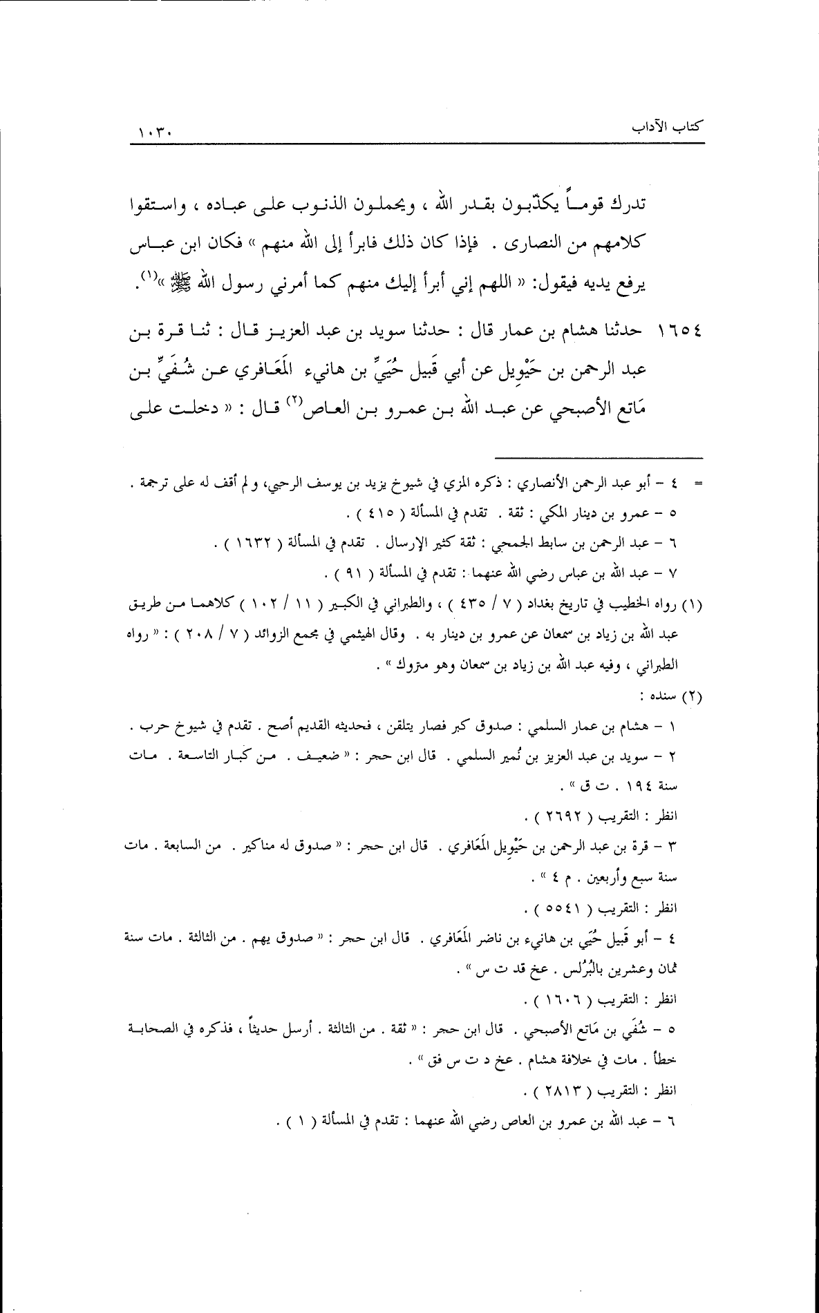 حدثنا هشام بن عمار قال: حدثنا سويد بن عبد العزيز قال: ثنا قرة بن عبد الرحمن بن حويل، عن أبي قبيل حيي بن هانئ المعافري، عن شقي بن ماتع الأصبحي، عن عبد الله بن عمرو بن العاص قال: دخلت على
