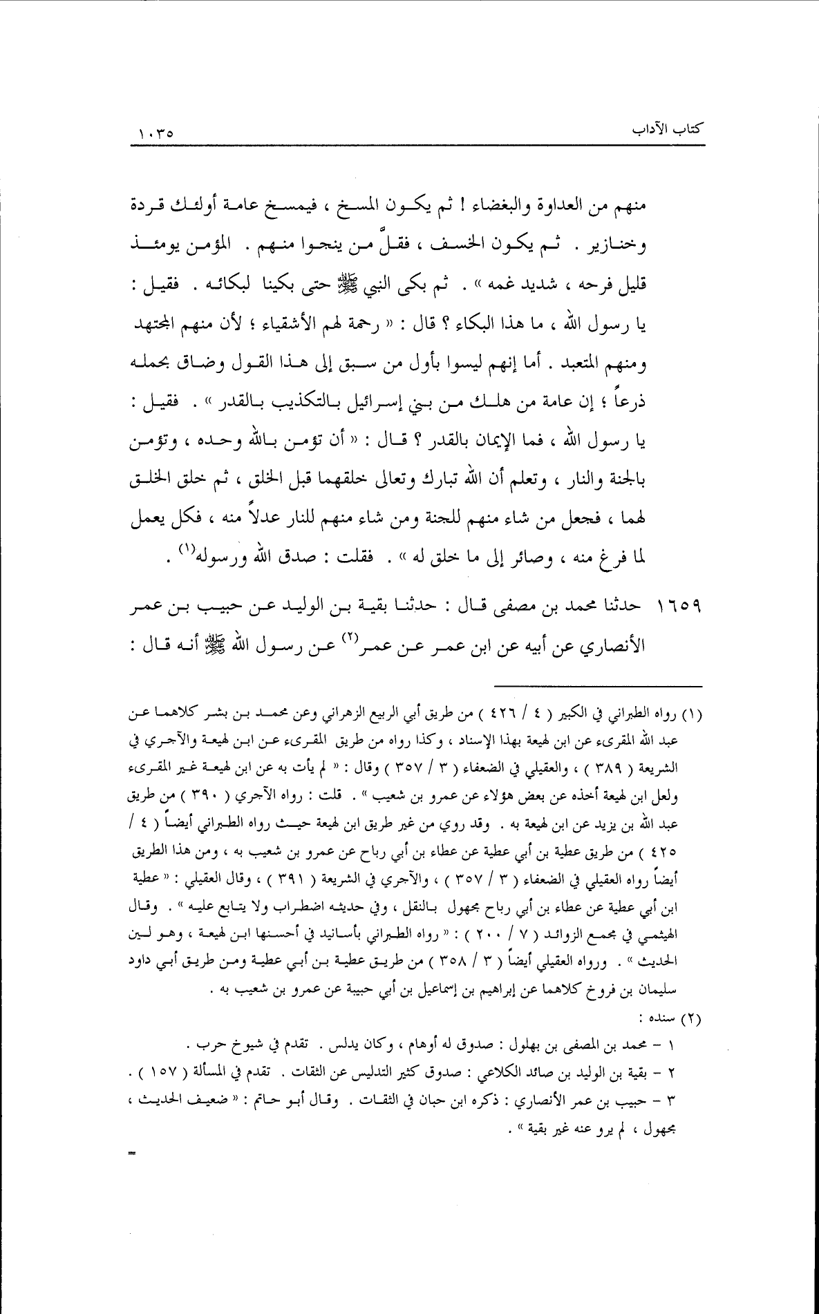 حدثنا محمد بن مصفى قال: حدثنا بقية بن الوليد، عن حبيب بن عمر الأنصاري، عن أبيه، عن ابن عمر، عن رسول الله - صلى الله عليه وسلم - أنه قال: