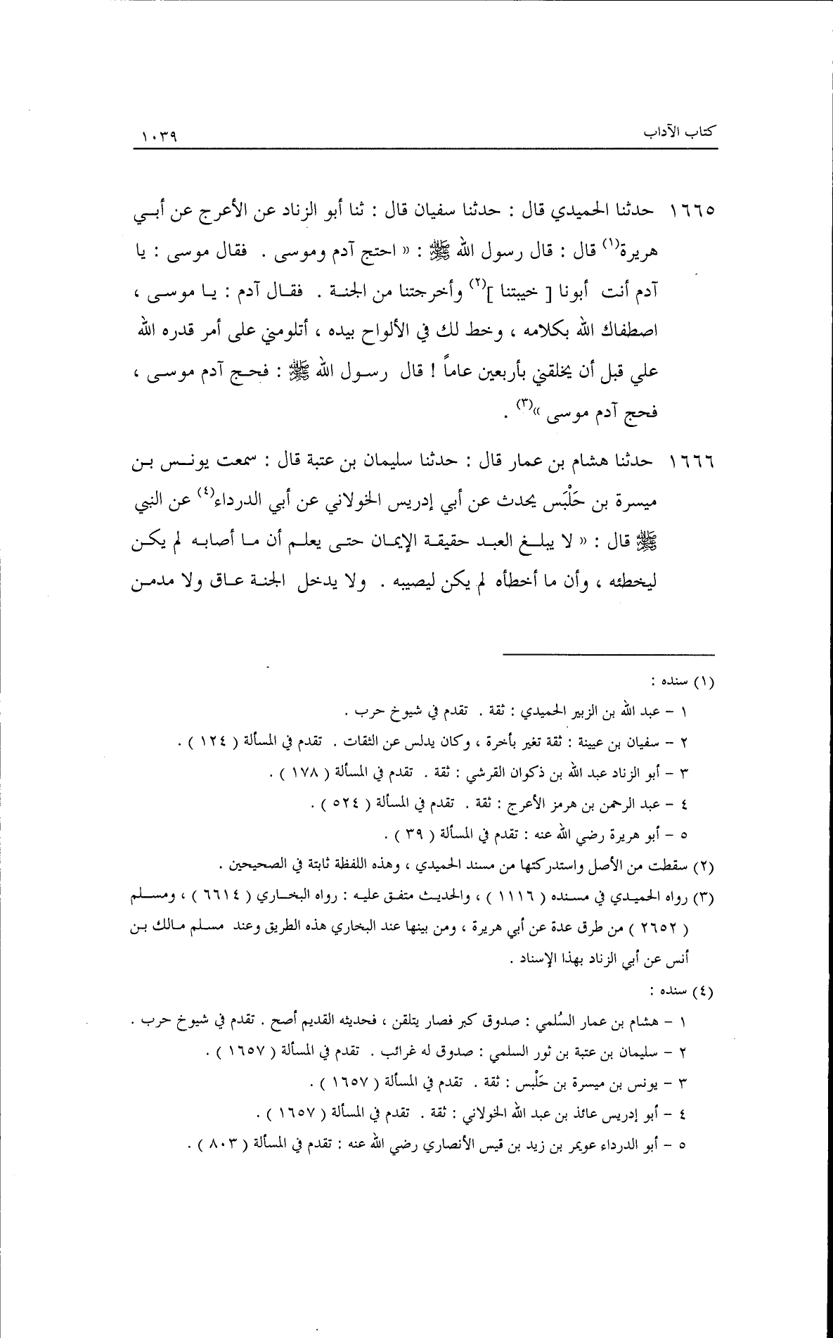 حدثنا الحميدي قال: حدثنا سفيان قال: ثنا أبو الزناد، عن الأعرج، عن أبي هريرة قال: قال رسول الله - صلى الله عليه وسلم -: ((احتج آدم وموسى فقال موسى: يا آدم أنت أبو نا وأخرجتنا من الجنة. فقال آدم: يا موسى، اصطفاك الله بكلامه، وخط لك في الألواح بيده، أتلومني على أمر قدره الله عليّ قبل أن يخلقني بأربعين عامًا؟)) قال رسول الله - صلى الله عليه وسلم -: ((فحج آدم موسى، فحج آدم موسى)).